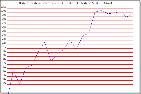 ZávodBodyVýkonnostZměna| 30.08.2006 | Veselka Popůvky Vintrovna, 7.9 km | 77.90% | 77.90% | | | 16.05.2007 | Pisárky Anthropos, 6.6 km | 85.44% | 83.21% | +5.31% | | 23.05.2007 | Obřany, 8.8 km | 82.04% | 83.14% | -0.07% | | 06.06.2007 | Veselka, Popůvky Vintrovna, 7.9 km | 86.21% | 84.75% | +1.61% | | 20.05.2009 | Obřany, 8.8 km | 86.81% | 85.71% | +0.96% | | 25.05.2011 | Obřany, 8.8 km | 90.25% | 87.52% | +1.81% | | 13.07.2011 | Popůvky, 7.9 km | 92.57% | 89.36% | +1.84% | | 06.06.2012 | Popůvky, 7.9 km | 87.76% | 89.11% | -0.25% | | 13.06.2012 | Pisárky Anthropos, 6 km | 89.64% | 89.43% | +0.32% | | 27.06.2012 | Obřany, 8.8 km | 90.67% | 89.93% | +0.50% | | 19.08.2020 | Obřany, 8.8 km | 93.06% | 90.96% | +1.03% | | 26.08.2020 | Atletický stadión Pod Palackého vrche | 90.71% | 91.05% | +0.09% | | 02.09.2020 | Líšeň, 11 km | 94.05% | 92.01% | +0.96% | | 09.09.2020 | Pisárky Anthropos, 6 km | 94.76% | 92.85% | +0.84% | | 02.06.2021 | Pod Palackého vrchem 10 km | 100.10% | 94.93% | +2.08% | | 09.06.2021 | Pisárky | 100.49% | 96.60% | +1.67% | | 23.06.2021 | Obřany | 99.65% | 97.68% | +1.08% | | 30.06.2021 | Líšeň | 99.81% | 98.54% | +0.86% | | 14.07.2021 | Myslivna | 100.11% | 99.21% | +0.67% | | 11.08.2021 | Popůvky | 98.77% | 99.35% | +0.14% | | 25.08.2021 | Líšeň | 99.81% | 99.69% | +0.34% | | | | |