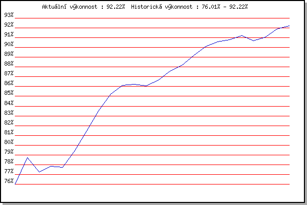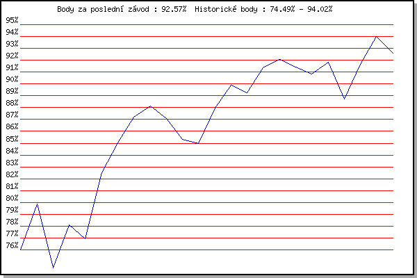 ZávodBodyVýkonnostZměna| 30.08.2006 | Veselka Popůvky Vintrovna, 7.9 km | 76.01% | 76.01% | | | 14.05.2008 | Pisárky Anthropos, 6.3 km | 79.90% | 78.73% | +2.72% | | 11.06.2008 | Pisárky Anthropos, 6.3 km | 74.49% | 77.24% | -1.49% | | 17.06.2015 | Pisárky Anthropos, 6 km | 78.14% | 77.85% | +0.61% | | 05.08.2015 | Obřany, 8.8 km | 76.92% | 77.73% | -0.12% | | 06.06.2018 | Pisárky Anthropos, 6 km | 82.49% | 79.49% | +1.76% | | 20.06.2018 | Palackého vrch, 7.1 km | 85.02% | 81.46% | +1.97% | | 27.06.2018 | Popůvky, 7.9 km | 87.22% | 83.49% | +2.03% | | 11.07.2018 | Hotel Myslivna, 7 km | 88.13% | 85.21% | +1.72% | | 18.07.2018 | Obřany, 8.8 km | 87.11% | 86.12% | +0.91% | | 25.07.2018 | Líšeň, 11 km | 85.31% | 86.22% | +0.10% | | 05.09.2018 | Obřany, 8.8 km | 85.00% | 86.09% | -0.13% | | 12.09.2018 | Pisárky Anthropos, 6 km | 87.97% | 86.67% | +0.58% | | 17.04.2019 | Atletický stadión Pod Palackého vrche | 89.92% | 87.61% | +0.94% | | 26.06.2019 | Pisárky Anthropos, 6 km | 89.26% | 88.18% | +0.57% | | 11.09.2019 | Pisárky Anthropos, 6 km | 91.35% | 89.16% | +0.98% | | 08.07.2020 | Pisárky Anthropos, 6 km | 92.07% | 90.11% | +0.95% | | 26.08.2020 | Atletický stadión Pod Palackého vrche | 91.40% | 90.60% | +0.49% | | 09.09.2020 | Pisárky Anthropos, 6 km | 90.81% | 90.80% | +0.20% | | 09.06.2021 | Pisárky | 91.82% | 91.19% | +0.39% | | 23.06.2021 | Obřany | 88.74% | 90.70% | -0.49% | | 07.07.2021 | Pisárky | 91.64% | 91.04% | +0.34% | | 28.07.2021 | Palackého vrch | 94.02% | 91.91% | +0.87% | | 01.09.2021 | Obřany | 92.57% | 92.22% | +0.31% | | | | |