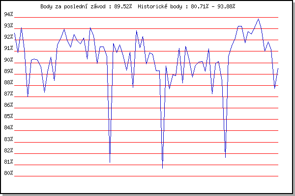 | 07.06.2006 | Líšeň Mariánské údolí, 11.1 km | 91.21% | 92.15% | -0.43% |
