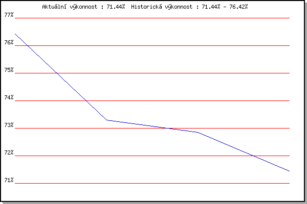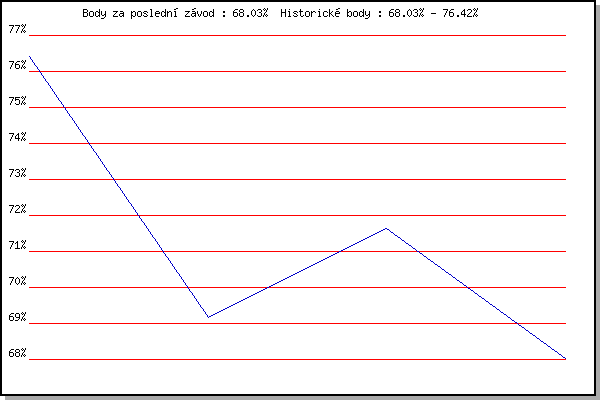 Závod| Body | Výkonnost | Změna | 16.05.2007 | Pisárky Anthropos, 6.6 km | 76.42% | 76.42% | | 16.07.2008 | Pisárky Anthropos, 6.3 km | 69.17% | 73.29% | -3.13% | 14.07.2010 | Veselka, Popůvky Vintrovna, 7.9 km | 71.64% | 72.86% | -0.43% | 25.07.2012 | Pisárky Anthropos, 6 km | 68.03% | 71.44% | -1.42% | | |