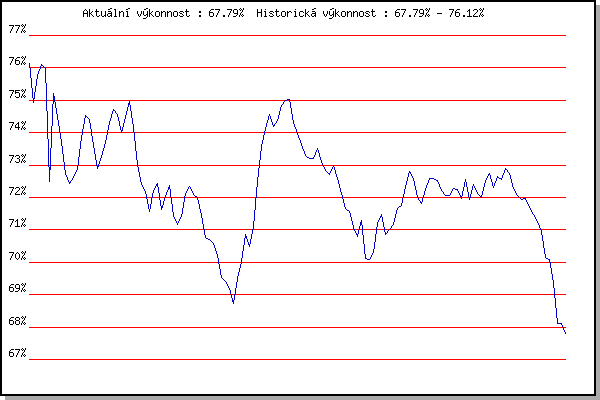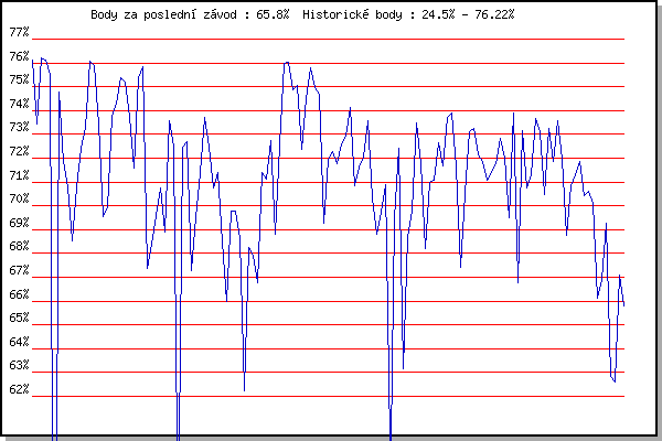 ZávodBodyVýkonnostZměna| 16.05.2007 | Pisárky Anthropos, 6.6 km | 76.12% | 76.12% | | | 20.06.2007 | Palackého vrch Běh Olympijského dne | 73.42% | 74.93% | -1.19% | | 27.06.2007 | Obřany, 8.8 km | 76.22% | 75.75% | +0.82% | | 04.07.2007 | Líšeň Mariánské údolí, 11.1 km | 76.14% | 76.11% | +0.36% | | 11.07.2007 | Veselka, Popůvky Vintrovna, 7.9 km | 75.53% | 75.97% | -0.14% | | 18.07.2007 | Moravská Slávia dráha, 15 km | 24.50% | 72.50% | -3.47% | | 25.07.2007 | Pisárky Anthropos, 6.6 km | 74.76% | 75.21% | +2.71% | | 01.08.2007 | Obřany, 8.8 km | 71.88% | 74.49% | -0.72% | | 08.08.2007 | Líšeň Mariánské údolí, 11.1 km | 70.80% | 73.70% | -0.79% | | 15.08.2007 | Moravská Slávia dráha, 10 km | 68.53% | 72.75% | -0.95% | | 22.08.2007 | Veselka, Popůvky Vintrovna, 7.9 km | 70.78% | 72.44% | -0.31% | | 28.09.2007 | Blažovice Svatováclavský běh, 11 km | 72.41% | 72.62% | +0.18% | | 08.05.2008 | Běh o pohár pivovaru Černá hora, 9.2 | 73.29% | 72.89% | +0.27% | | 14.05.2008 | Pisárky Anthropos, 6.3 km | 76.05% | 73.84% | +0.95% | | 11.06.2008 | Pisárky Anthropos, 6.3 km | 75.88% | 74.53% | +0.69% | | 18.06.2008 | Obřany, 8.8 km | 73.44% | 74.42% | -0.11% | | 21.06.2008 | Běh kolem Mohyly míru, 12.3 km | 69.53% | 73.61% | -0.81% | | 25.06.2008 | Běh Olympijského dne, 7.1 km | 69.90% | 72.88% | -0.73% | | 02.07.2008 | Líšeň Mariánské údolí, 11.1 km | 73.78% | 73.27% | +0.39% | | 09.07.2008 | Veselka, Popůvky Vintrovna, 7.9 km | 74.30% | 73.69% | +0.42% | | 16.07.2008 | Pisárky Anthropos, 6.3 km | 75.39% | 74.31% | +0.62% | | 23.07.2008 | Moravská Slavia , 15 km | 75.21% | 74.71% | +0.40% | | 30.07.2008 | Obřany, 8.8 km | 73.70% | 74.56% | -0.15% | | 06.08.2008 | Líšeň Mariánské údolí, 11.1 km | 71.57% | 74.01% | -0.55% | | 20.08.2008 | Moravská Slavia dráha, 10 km | 75.38% | 74.48% | +0.47% | | 28.09.2008 | Blažovice Svatováclavský běh, 11 km | 75.83% | 74.97% | +0.49% | | 08.05.2009 | Běh o pohár pivovaru Černá hora, 9. | 67.35% | 74.16% | -0.81% | | 13.05.2009 | Pisárky Anthropos, 6.3 km | 68.37% | 73.03% | -1.13% | | 17.06.2009 | Obřany, 8.8 km | 69.57% | 72.41% | -0.62% | | 24.06.2009 | Palackého vrch Běh Olympijského dne | 70.77% | 72.20% | -0.21% | | 01.07.2009 | Líšeň Mariánské údolí, 11.1 km | 68.91% | 71.58% | -0.62% | | 08.07.2009 | Veselka, Popůvky Vintrovna, 7.9 km | 73.57% | 72.21% | +0.63% | | 15.07.2009 | Pisárky Anthropos, 6.3 km | 72.48% | 72.44% | +0.23% | | 22.07.2009 | Moravská Slavia dráha, 15 km | 53.97% | 71.62% | -0.82% | | 29.07.2009 | Obřany, 8.8 km | 72.47% | 72.04% | +0.42% | | 05.08.2009 | Líšeň Mariánské údolí, 11.1 km | 72.70% | 72.38% | +0.34% | | 19.08.2009 | Moravská Slavia dráha, 10 km | 67.26% | 71.44% | -0.94% | | 28.09.2009 | Blažovice Svatováclavský běh, 11 km | 69.51% | 71.16% | -0.28% | | 08.05.2010 | Běh o pohár pivovaru Černá hora, 9. | 71.38% | 71.41% | +0.25% | | 12.05.2010 | Pisárky Anthropos, 6.3 km | 73.69% | 72.12% | +0.71% | | 19.05.2010 | Palackého vrch , 7.1 km | 72.46% | 72.34% | +0.22% | | 26.05.2010 | Obřany, 8.8 km | 70.74% | 72.08% | -0.26% | | 02.06.2010 | Líšeň Mariánské údolí, 11.1 km | 71.42% | 72.01% | -0.07% | | 09.06.2010 | Veselka, Popůvky Vintrovna, 7.9 km | 68.48% | 71.45% | -0.56% | | 16.06.2010 | Pisárky Anthropos, 6.3 km | 65.98% | 70.76% | -0.69% | | 23.06.2010 | Palackého vrch Běh Olympijského dne | 69.76% | 70.70% | -0.06% | | 21.07.2010 | Moravská Slavia dráha, 5 km | 69.79% | 70.59% | -0.11% | | 28.07.2010 | Pisárky Anthropos, 6.3 km | 68.60% | 70.20% | -0.39% | | 04.08.2010 | Palackého vrch , 7.1 km | 62.24% | 69.54% | -0.66% | | 18.08.2010 | Moravská Slavia dráha, 10 km | 68.25% | 69.42% | -0.12% | | 25.08.2010 | Líšeň Mariánské údolí, 11.1 km | 67.94% | 69.19% | -0.23% | | 01.09.2010 | Veselka, Popůvky Vintrovna, 7.9 km | 66.76% | 68.72% | -0.47% | | 08.09.2010 | Pisárky Anthropos, 6.3 km | 71.40% | 69.50% | +0.78% | | 22.09.2010 | Moravská Slavia dráha, 15 km | 71.13% | 70.04% | +0.54% | | 28.09.2010 | Blažovice Svatováclavský běh, 9.4 km | 72.72% | 70.85% | +0.81% | | 09.10.2010 | Mizuno sedmička, 7 km | 68.79% | 70.48% | -0.37% | | 11.05.2011 | Pisárky Anthropos, 6 km | 72.55% | 71.12% | +0.64% | | 08.06.2011 | Veselka, Popůvky Vintrovna, 7.9 km | 75.99% | 72.50% | +1.38% | | 15.06.2011 | Pisárky Anthropos, 6 km | 76.03% | 73.57% | +1.07% | | 23.06.2011 | Palackého vrch – Běh Olympijského dne | 74.87% | 74.13% | +0.56% | | 29.06.2011 | Obřany, 8.8 km | 75.06% | 74.56% | +0.43% | | 13.07.2011 | Popůvky, 7.9 km | 72.39% | 74.19% | -0.37% | | 20.07.2011 | AC Moravská Slávia, 5km atletický o | 74.52% | 74.38% | +0.19% | | 27.07.2011 | Pisárky Anthropos, 6 km | 75.80% | 74.83% | +0.45% | | 03.08.2011 | Palackého vrch, 7.1 km | 74.95% | 74.98% | +0.15% | | 10.08.2011 | Obřany, 8.8 km | 74.69% | 75.03% | +0.05% | | 17.08.2011 | AC Moravská Slávia, 10km atletický | 69.26% | 74.30% | -0.73% | | 24.08.2011 | Líšeň Mariánské údolí, 11.1 km | 71.94% | 73.96% | -0.34% | | 31.08.2011 | Popůvky, 7.9 km | 72.29% | 73.65% | -0.31% | | 21.09.2011 | AC Moravská Slávia Brno, 1hod atlet | 71.75% | 73.29% | -0.36% | | 28.09.2011 | Blažovice – Svatováclavský běh , 11 k | 72.62% | 73.19% | -0.10% | | 09.05.2012 | Pisárky Anthropos, 6 km | 72.92% | 73.20% | +0.01% | | 16.05.2012 | Palackého vrch, 7.1 km | 74.12% | 73.50% | +0.30% | | 23.05.2012 | Obřany, 8.8 km | 70.82% | 73.10% | -0.40% | | 30.05.2012 | Líšeň Mariánské údolí, 11 km | 71.61% | 72.84% | -0.26% | | 06.06.2012 | Popůvky, 7.9 km | 72.06% | 72.70% | -0.14% | | 13.06.2012 | Pisárky Anthropos, 6 km | 73.58% | 72.98% | +0.28% | | 20.06.2012 | Palackého vrch – Běh Olympijského dne | 70.31% | 72.59% | -0.39% | | 27.06.2012 | Obřany, 8.8 km | 68.80% | 72.12% | -0.47% | | 18.07.2012 | Atletický stadión Pod Palackého vrche | 69.71% | 71.65% | -0.47% | | 25.07.2012 | Pisárky Anthropos, 6 k