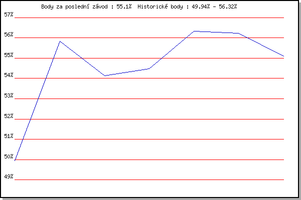 Závod| Body | Výkonnost | Změna | 21.06.2008 | Běh kolem Mohyly míru, 12.3 km | 49.94% | 49.94% | | 25.06.2008 | Běh Olympijského dne, 7.1 km | 55.84% | 54.11% | +4.17% | 16.07.2008 | Pisárky Anthropos, 6.3 km | 54.14% | 54.53% | +0.42% | 23.07.2008 | Moravská Slavia , 15 km | 54.49% | 54.75% | +0.22% | 08.05.2009 | Běh o pohár pivovaru Černá hora, 9. | 56.32% | 55.39% | +0.64% | 24.06.2009 | Palackého vrch Běh Olympijského dne | 56.24% | 55.76% | +0.37% | 12.08.2009 | Veselka, Popůvky Vintrovna, 7.9 km | 55.10% | 55.64% | -0.12% | | |
