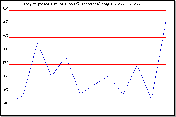 ZávodBodyVýkonnostZměna| 23.05.2007 | Obřany, 8.8 km | 64.17% | 64.16% | | | 27.06.2007 | Obřany, 8.8 km | 64.72% | 64.55% | +0.39% | | 12.05.2010 | Pisárky Anthropos, 6.3 km | 68.59% | 66.69% | +2.14% | | 26.05.2010 | Obřany, 8.8 km | 66.15% | 66.66% | -0.03% | | 09.10.2010 | Mizuno sedmička, 7 km | 67.58% | 67.14% | +0.48% | | 28.09.2011 | Blažovice – Svatováclavský běh , 11 k | 64.83% | 66.53% | -0.61% | | 27.06.2012 | Obřany, 8.8 km | 65.52% | 66.32% | -0.21% | | 28.09.2012 | Blažovice – Svatováclavský běh, 11 km | 66.16% | 66.36% | +0.04% | | 01.07.2015 | Obřany, 8.8 km | 64.77% | 66.00% | -0.36% | | 18.07.2018 | Obřany, 8.8 km | 66.96% | 66.34% | +0.34% | | 12.09.2018 | Pisárky Anthropos, 6 km | 64.43% | 65.98% | -0.36% | | 15.05.2019 | Kociánka, 3.2 km | 70.17% | 67.21% | +1.23% | | | | |