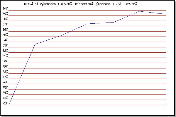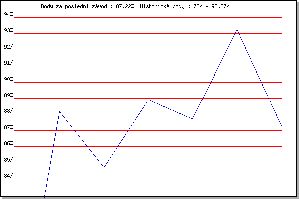 Závod| Body | Výkonnost | Změna | 03.07.2013 | Obřany, 8.8 km | 72.00% | 72.00% | | 13.05.2015 | Pisárky Anthropos, 6 km | 88.18% | 83.57% | +11.57% | 27.05.2015 | Obřany, 8.8 km | 84.71% | 85.24% | +1.67% | 17.06.2015 | Pisárky Anthropos, 6 km | 88.91% | 87.45% | +2.21% | 16.09.2015 | Pisárky Anthropos, 6 km | 87.70% | 87.74% | +0.29% | 15.06.2016 | Pisárky Anthropos, 6 km | 93.27% | 89.85% | +2.11% | 16.08.2017 | Obřany, 8.8 km | 87.22% | 89.25% | -0.60% | | |