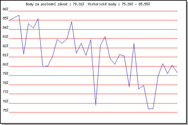 ZávodBodyVýkonnostZměna| 23.05.2007 | Obřany, 8.8 km | 84.98% | 84.98% | | | 30.05.2007 | Líšeň Mariánské údolí, 11.1 km | 85.30% | 85.20% | +0.22% | | 06.06.2007 | Veselka, Popůvky Vintrovna, 7.9 km | 85.55% | 85.40% | +0.20% | | 20.06.2007 | Palackého vrch Běh Olympijského dne | 81.33% | 84.64% | -0.76% | | 11.07.2007 | Veselka, Popůvky Vintrovna, 7.9 km | 84.65% | 84.88% | +0.24% | | 25.07.2007 | Pisárky Anthropos, 6.6 km | 84.14% | 84.78% | -0.10% | | 08.08.2007 | Líšeň Mariánské údolí, 11.1 km | 85.15% | 84.94% | +0.16% | | 14.05.2008 | Pisárky Anthropos, 6.3 km | 80.00% | 84.21% | -0.73% | | 28.05.2008 | Líšeň Mariánské údolí, 11.1 km | 80.01% | 83.26% | -0.95% | | 04.06.2008 | Veselka, Popůvky Vintrovna, 9.6 km | 81.05% | 82.83% | -0.43% | | 18.06.2008 | Obřany, 8.8 km | 82.90% | 82.99% | +0.16% | | 25.06.2008 | Běh Olympijského dne, 7.1 km | 82.50% | 83.02% | +0.03% | | 09.07.2008 | Veselka, Popůvky Vintrovna, 7.9 km | 82.98% | 83.11% | +0.09% | | 13.08.2008 | Veselka, Popůvky Vintrovna, 7.9 km | 84.85% | 83.67% | +0.56% | | 08.05.2009 | Běh o pohár pivovaru Černá hora, 9. | 81.40% | 83.21% | -0.46% | | 13.05.2009 | Pisárky Anthropos, 6.3 km | 82.50% | 83.12% | -0.09% | | 20.05.2009 | Obřany, 8.8 km | 81.19% | 82.74% | -0.38% | | 03.06.2009 | Veselka, Popůvky Vintrovna, 7.9 km | 82.88% | 82.86% | +0.12% | | 17.06.2009 | Obřany, 8.8 km | 75.78% | 82.44% | -0.42% | | 24.06.2009 | Palackého vrch Běh Olympijského dne | 82.30% | 82.53% | +0.09% | | 12.08.2009 | Veselka, Popůvky Vintrovna, 7.9 km | 83.23% | 82.78% | +0.25% | | 12.05.2010 | Pisárky Anthropos, 6.3 km | 80.84% | 82.40% | -0.38% | | 19.05.2010 | Palackého vrch , 7.1 km | 80.22% | 82.01% | -0.39% | | 16.06.2010 | Pisárky Anthropos, 6.3 km | 81.28% | 81.92% | -0.09% | | 23.06.2010 | Palackého vrch Běh Olympijského dne | 81.11% | 81.79% | -0.13% | | 30.06.2010 | Obřany, 8.8 km | 77.75% | 81.36% | -0.43% | | 18.05.2011 | Palackého vrch, 7.1 km | 82.51% | 81.80% | +0.44% | | 27.06.2012 | Obřany, 8.8 km | 77.55% | 81.02% | -0.78% | | 15.05.2013 | Pisárky Anthropos, 6 km | 77.92% | 80.42% | -0.60% | | 07.08.2013 | Obřany, 8.8 km | 75.39% | 79.82% | -0.60% | | 25.04.2018 | Atletický stadión Pod Palackého vrche | 75.41% | 78.96% | -0.86% | | 09.05.2018 | Popůvky, 7.9 km | 78.95% | 79.13% | +0.17% | | 16.05.2018 | Palackého vrch, 7.1 km | 80.29% | 79.61% | +0.48% | | 23.05.2018 | Obřany, 8.8 km | 79.21% | 79.68% | +0.07% | | 27.06.2018 | Popůvky, 7.9 km | 80.11% | 79.89% | +0.21% | | 05.09.2018 | Obřany, 8.8 km | 79.31% | 79.85% | -0.04% | | | | |