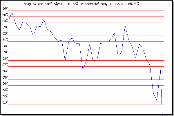 ZávodBodyVýkonnostZměna| 24.05.2006 | Obřany, 8.8 km | 64.42% | 64.42% | | | 31.05.2006 | Palackého vrch vodárna, 9 km | 65.61% | 65.25% | +0.83% | | 07.06.2006 | Líšeň Mariánské údolí, 11.1 km | 63.76% | 64.74% | -0.51% | | 22.06.2006 | Palackého vrch dráha, 5 km | 62.80% | 64.25% | -0.49% | | 28.06.2006 | Pisárky Anthropos, 6.6 km | 64.15% | 64.32% | +0.07% | | 12.07.2006 | Obřany, 8.8 km | 63.93% | 64.26% | -0.06% | | 19.07.2006 | Líšeň Mariánské údolí, 11.1 km | 63.41% | 64.05% | -0.21% | | 02.08.2006 | Pisárky Anthropos, 6.6 km | 61.91% | 63.75% | -0.30% | | 09.08.2006 | Palackého vrch, 9 km | 63.52% | 63.77% | +0.02% | | 16.08.2006 | Obřany, 8.8 km | 63.34% | 63.70% | -0.07% | | 23.08.2006 | Líšeň Mariánské údolí, 11.1 km | 64.45% | 63.93% | +0.23% | | 30.08.2006 | Veselka Popůvky Vintrovna, 7.9 km | 62.96% | 63.74% | -0.19% | | 23.05.2007 | Obřany, 8.8 km | 62.55% | 63.53% | -0.21% | | 06.06.2007 | Veselka, Popůvky Vintrovna, 7.9 km | 61.69% | 63.27% | -0.26% | | 13.06.2007 | Pisárky Anthropos, 6.6 km | 61.05% | 62.94% | -0.33% | | 18.07.2007 | Moravská Slávia dráha, 15 km | 61.29% | 62.61% | -0.33% | | 08.05.2008 | Běh o pohár pivovaru Černá hora, 9.2 | 57.94% | 62.28% | -0.33% | | 04.06.2008 | Veselka, Popůvky Vintrovna, 9.6 km | 60.84% | 62.00% | -0.28% | | 11.06.2008 | Pisárky Anthropos, 6.3 km | 61.62% | 61.97% | -0.03% | | 30.07.2008 | Obřany, 8.8 km | 60.62% | 61.71% | -0.26% | | 19.05.2010 | Palackého vrch , 7.1 km | 60.75% | 61.52% | -0.19% | | 26.05.2010 | Obřany, 8.8 km | 56.55% | 61.12% | -0.40% | | 30.06.2010 | Obřany, 8.8 km | 57.91% | 60.49% | -0.63% | | 07.07.2010 | Líšeň Mariánské údolí, 11.1 km | 60.60% | 60.65% | +0.16% | | 14.07.2010 | Veselka, Popůvky Vintrovna, 7.9 km | 57.71% | 60.08% | -0.57% | | 21.07.2010 | Moravská Slavia dráha, 5 km | 58.07% | 59.70% | -0.38% | | 28.07.2010 | Pisárky Anthropos, 6.3 km | 60.70% | 60.05% | +0.35% | | 04.08.2010 | Palackého vrch , 7.1 km | 60.75% | 60.33% | +0.28% | | 11.08.2010 | Obřany, 8.8 km | 60.78% | 60.56% | +0.23% | | 18.08.2010 | Moravská Slavia dráha, 10 km | 61.47% | 60.91% | +0.35% | | 25.08.2010 | Líšeň Mariánské údolí, 11.1 km | 62.36% | 61.38% | +0.47% | | 01.09.2010 | Veselka, Popůvky Vintrovna, 7.9 km | 58.64% | 60.86% | -0.52% | | 08.09.2010 | Pisárky Anthropos, 6.3 km | 59.35% | 60.60% | -0.26% | | 22.09.2010 | Moravská Slavia dráha, 15 km | 63.58% | 61.45% | +0.85% | | 28.09.2010 | Blažovice Svatováclavský běh, 9.4 km | 61.33% | 61.54% | +0.09% | | 09.10.2010 | Mizuno sedmička, 7 km | 60.23% | 61.33% | -0.21% | | 15.06.2011 | Pisárky Anthropos, 6 km | 58.41% | 60.82% | -0.51% | | 29.06.2011 | Obřany, 8.8 km | 60.56% | 60.88% | +0.06% | | 03.08.2011 | Palackého vrch, 7.1 km | 59.95% | 60.75% | -0.13% | | 14.09.2011 | Líšeň Mariánské údolí, 11.1 km | 58.16% | 60.29% | -0.46% | | 21.09.2011 | AC Moravská Slávia Brno, 1hod atlet | 57.29% | 59.87% | -0.42% | | 08.08.2012 | Obřany, 8.8 km | 52.86% | 59.35% | -0.52% | | 29.08.2012 | Pisárky Anthropos, 6 km | 51.60% | 58.11% | -1.24% | | 19.09.2012 | Atletický stadión Pod Palackého vrche | 56.50% | 57.97% | -0.14% | | 17.09.2014 | Pisárky Anthropos, 6 km | 41.62% | 56.80% | -1.17% | | | | |