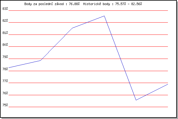 Závod| Body | Výkonnost | Změna | 13.06.2007 | Pisárky Anthropos, 6.6 km | 78.26% | 78.26% | | 25.07.2007 | Pisárky Anthropos, 6.6 km | 78.86% | 78.68% | +0.42% | 01.08.2007 | Obřany, 8.8 km | 81.53% | 80.19% | +1.51% | 30.07.2008 | Obřany, 8.8 km | 82.56% | 81.34% | +1.15% | 20.06.2012 | Palackého vrch – Běh Olympijského dne | 75.57% | 80.14% | -1.20% | 25.07.2012 | Pisárky Anthropos, 6 km | 76.88% | 79.35% | -0.79% | | |