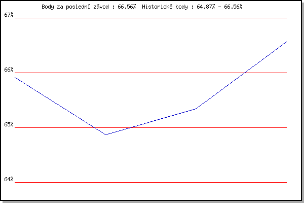 Závod| Body | Výkonnost | Změna | 17.07.2013 | Atletický stadión Pod Palackého vrche | 65.92% | 65.92% | | 26.08.2015 | Popůvky, 7.9 km | 64.87% | 65.45% | -0.47% | 10.08.2016 | Hotel Myslivna, 7 km | 65.34% | 65.45% | 0.00% | 17.08.2016 | Líšeň, 11 km | 66.56% | 65.98% | +0.53% | | |