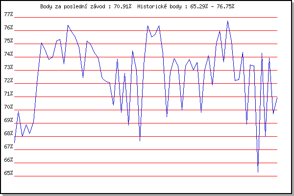 ZávodBodyVýkonnostZměna| 13.06.2007 | Pisárky Anthropos, 6.6 km | 67.51% | 67.51% | | | 27.06.2007 | Obřany, 8.8 km | 69.89% | 69.17% | +1.66% | | 25.07.2007 | Pisárky Anthropos, 6.6 km | 68.02% | 68.75% | -0.42% | | 01.08.2007 | Obřany, 8.8 km | 68.90% | 68.91% | +0.16% | | 08.08.2007 | Líšeň Mariánské údolí, 11.1 km | 68.24% | 68.72% | -0.19% | | 22.08.2007 | Veselka, Popůvky Vintrovna, 7.9 km | 69.10% | 68.90% | +0.18% | | 28.09.2007 | Blažovice Svatováclavský běh, 11 km | 72.41% | 70.07% | +1.17% | | 14.05.2008 | Pisárky Anthropos, 6.3 km | 75.06% | 71.71% | +1.64% | | 21.05.2008 | Obřany, 8.8 km | 74.58% | 72.74% | +1.03% | | 28.05.2008 | Líšeň Mariánské údolí, 11.1 km | 73.82% | 73.25% | +0.51% | | 11.06.2008 | Pisárky Anthropos, 6.3 km | 73.99% | 73.67% | +0.42% | | 18.06.2008 | Obřany, 8.8 km | 75.23% | 74.32% | +0.65% | | 21.06.2008 | Běh kolem Mohyly míru, 12.3 km | 75.33% | 74.71% | +0.39% | | 02.07.2008 | Líšeň Mariánské údolí, 11.1 km | 73.48% | 74.47% | -0.24% | | 09.07.2008 | Veselka, Popůvky Vintrovna, 7.9 km | 76.42% | 75.03% | +0.56% | | 16.07.2008 | Pisárky Anthropos, 6.3 km | 75.89% | 75.33% | +0.30% | | 23.07.2008 | Moravská Slavia , 15 km | 75.50% | 75.47% | +0.14% | | 30.07.2008 | Obřany, 8.8 km | 74.69% | 75.35% | -0.12% | | 20.08.2008 | Moravská Slavia dráha, 10 km | 72.45% | 74.92% | -0.43% | | 28.09.2008 | Blažovice Svatováclavský běh, 11 km | 75.21% | 75.11% | +0.19% | | 13.05.2009 | Pisárky Anthropos, 6.3 km | 74.98% | 75.17% | +0.06% | | 20.05.2009 | Obřany, 8.8 km | 74.34% | 75.02% | -0.15% | | 27.05.2009 | Líšeň Mariánské údolí, 11.1 km | 73.94% | 74.81% | -0.21% | | 03.06.2009 | Veselka, Popůvky Vintrovna, 7.9 km | 72.42% | 74.46% | -0.35% | | 10.06.2009 | Pisárky Anthropos, 6.3 km | 72.16% | 74.06% | -0.40% | | 17.06.2009 | Obřany, 8.8 km | 72.08% | 73.68% | -0.38% | | 24.06.2009 | Palackého vrch Běh Olympijského dne | 70.37% | 73.35% | -0.33% | | 01.07.2009 | Líšeň Mariánské údolí, 11.1 km | 73.85% | 73.55% | +0.20% | | 08.07.2009 | Veselka, Popůvky Vintrovna, 7.9 km | 69.81% | 72.98% | -0.57% | | 15.07.2009 | Pisárky Anthropos, 6.3 km | 72.78% | 73.06% | +0.08% | | 22.07.2009 | Moravská Slavia dráha, 15 km | 68.87% | 72.44% | -0.62% | | 29.07.2009 | Obřany, 8.8 km | 74.47% | 73.08% | +0.64% | | 05.08.2009 | Líšeň Mariánské údolí, 11.1 km | 73.00% | 73.22% | +0.14% | | 12.08.2009 | Veselka, Popůvky Vintrovna, 7.9 km | 67.66% | 72.44% | -0.78% | | 19.08.2009 | Moravská Slavia dráha, 10 km | 73.41% | 72.85% | +0.41% | | 28.09.2009 | Blažovice Svatováclavský běh, 11 km | 76.35% | 73.93% | +1.08% | | 12.05.2010 | Pisárky Anthropos, 6.3 km | 75.53% | 74.53% | +0.60% | | 19.05.2010 | Palackého vrch , 7.1 km | 75.70% | 74.95% | +0.42% | | 26.05.2010 | Obřany, 8.8 km | 76.36% | 75.41% | +0.46% | | 02.06.2010 | Líšeň Mariánské údolí, 11.1 km | 74.26% | 75.24% | -0.17% | | 09.06.2010 | Veselka, Popůvky Vintrovna, 7.9 km | 69.48% | 74.43% | -0.81% | | 23.06.2010 | Palackého vrch Běh Olympijského dne | 72.85% | 74.28% | -0.15% | | 30.06.2010 | Obřany, 8.8 km | 73.90% | 74.35% | +0.07% | | 07.07.2010 | Líšeň Mariánské údolí, 11.1 km | 73.34% | 74.18% | -0.17% | | 14.07.2010 | Veselka, Popůvky Vintrovna, 7.9 km | 70.01% | 73.50% | -0.68% | | 21.07.2010 | Moravská Slavia dráha, 5 km | 73.32% | 73.63% | +0.13% | | 28.07.2010 | Pisárky Anthropos, 6.3 km | 73.83% | 73.85% | +0.22% | | 04.08.2010 | Palackého vrch , 7.1 km | 73.04% | 73.71% | -0.14% | | 11.08.2010 | Obřany, 8.8 km | 73.58% | 73.72% | +0.01% | | 25.08.2010 | Líšeň Mariánské údolí, 11.1 km | 69.80% | 73.18% | -0.54% | | 01.09.2010 | Veselka, Popůvky Vintrovna, 7.9 km | 72.99% | 73.29% | +0.11% | | 08.09.2010 | Pisárky Anthropos, 6.3 km | 74.11% | 73.64% | +0.35% | | 22.09.2010 | Moravská Slavia dráha, 15 km | 71.88% | 73.29% | -0.35% | | 28.09.2010 | Blažovice Svatováclavský běh, 9.4 km | 75.04% | 73.80% | +0.51% | | 11.05.2011 | Pisárky Anthropos, 6 km | 75.97% | 74.44% | +0.64% | | 18.05.2011 | Palackého vrch, 7.1 km | 73.61% | 74.34% | -0.10% | | 25.05.2011 | Obřany, 8.8 km | 76.75% | 75.02% | +0.68% | | 01.06.2011 | Líšeň Mariánské údolí, 11.1 km | 75.17% | 75.15% | +0.13% | | 08.06.2011 | Veselka, Popůvky Vintrovna, 7.9 km | 72.22% | 74.64% | -0.51% | | 15.06.2011 | Pisárky Anthropos, 6 km | 72.28% | 74.18% | -0.46% | | 23.06.2011 | Palackého vrch – Běh Olympijského dne | 74.37% | 74.32% | +0.14% | | 13.07.2011 | Popůvky, 7.9 km | 68.93% | 73.83% | -0.49% | | 20.07.2011 | AC Moravská Slávia, 5km atletický o | 73.42% | 73.86% | +0.03% | | 27.07.2011 | Pisárky Anthropos, 6 km | 73.35% | 73.82% | -0.04% | | 03.08.2011 | Palackého vrch, 7.1 km | 65.29% | 73.06% | -0.76% | | 10.08.2011 | Obřany, 8.8 km | 74.30% | 73.57% | +0.51% | | 17.08.2011 | AC Moravská Slávia, 10km atletický | 68.01% | 72.53% | -1.04% | | 07.09.2011 | Pisárky Anthropos, 6 km | 73.91% | 73.10% | +0.57% | | 21.09.2011 | AC Moravská Slávia Brno, 1hod atlet | 69.69% | 72.51% | -0.59% | | 28.09.2011 | Blažovice – Svatováclavský běh , 11 k | 70.91% | 72.29% | -0.22% | | | | |