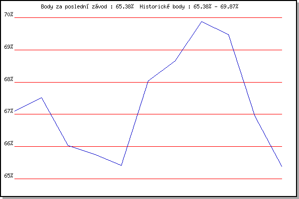 ZávodBodyVýkonnostZměna| 17.05.2006 | Pisárky Anthropos, 6.6 km | 67.10% | 67.10% | | | 24.05.2006 | Obřany, 8.8 km | 67.51% | 67.38% | +0.28% | | 28.06.2006 | Pisárky Anthropos, 6.6 km | 66.04% | 66.99% | -0.39% | | 12.07.2006 | Obřany, 8.8 km | 65.76% | 66.62% | -0.37% | | 25.07.2006 | Veselka Popůvky Vintrovna, 7.9 km | 65.42% | 66.32% | -0.30% | | 02.08.2006 | Pisárky Anthropos, 6.6 km | 68.04% | 66.97% | +0.65% | | 09.08.2006 | Palackého vrch, 9 km | 68.66% | 67.59% | +0.62% | | 16.08.2006 | Obřany, 8.8 km | 69.87% | 68.39% | +0.80% | | 23.08.2006 | Líšeň Mariánské údolí, 11.1 km | 69.47% | 68.84% | +0.45% | | 30.08.2006 | Veselka Popůvky Vintrovna, 7.9 km | 66.95% | 68.45% | -0.39% | | 23.05.2007 | Obřany, 8.8 km | 65.38% | 67.87% | -0.58% | | | | |