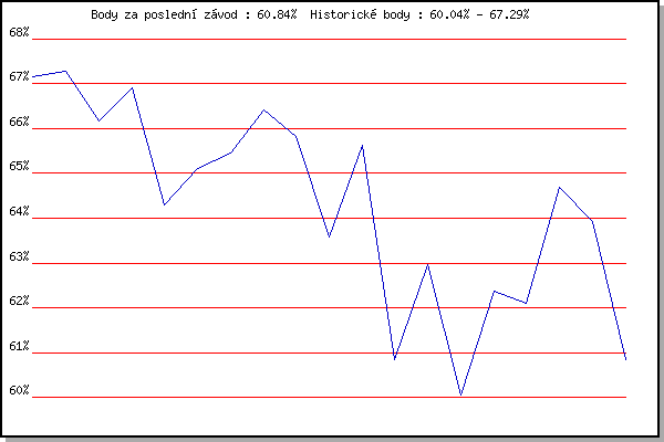 ZávodBodyVýkonnostZměna| 27.06.2007 | Obřany, 8.8 km | 67.16% | 67.16% | | | 11.07.2007 | Veselka, Popůvky Vintrovna, 7.9 km | 67.29% | 67.25% | +0.09% | | 25.07.2007 | Pisárky Anthropos, 6.6 km | 66.16% | 66.95% | -0.30% | | 01.08.2007 | Obřany, 8.8 km | 66.91% | 67.00% | +0.05% | | 14.05.2008 | Pisárky Anthropos, 6.3 km | 64.29% | 66.53% | -0.47% | | 02.07.2008 | Líšeň Mariánské údolí, 11.1 km | 65.12% | 66.20% | -0.33% | | 16.07.2008 | Pisárky Anthropos, 6.3 km | 65.46% | 66.05% | -0.15% | | 23.07.2008 | Moravská Slavia , 15 km | 66.42% | 66.22% | +0.17% | | 30.07.2008 | Obřany, 8.8 km | 65.83% | 66.17% | -0.05% | | 20.08.2008 | Moravská Slavia dráha, 10 km | 63.58% | 65.82% | -0.35% | | 12.05.2010 | Pisárky Anthropos, 6.3 km | 65.63% | 65.86% | +0.04% | | 30.06.2010 | Obřany, 8.8 km | 60.84% | 65.35% | -0.51% | | 28.07.2010 | Pisárky Anthropos, 6.3 km | 62.97% | 64.88% | -0.47% | | 01.09.2010 | Veselka, Popůvky Vintrovna, 7.9 km | 60.04% | 64.11% | -0.77% | | 08.09.2010 | Pisárky Anthropos, 6.3 km | 62.36% | 63.84% | -0.27% | | 11.05.2011 | Pisárky Anthropos, 6 km | 62.11% | 63.55% | -0.29% | | 10.08.2011 | Obřany, 8.8 km | 64.68% | 63.93% | +0.38% | | 31.08.2011 | Popůvky, 7.9 km | 63.93% | 64.02% | +0.09% | | 09.05.2012 | Pisárky Anthropos, 6 km | 60.84% | 63.47% | -0.55% | | | | |