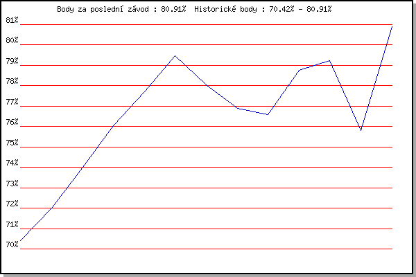 ZávodBodyVýkonnostZměna| 11.07.2007 | Veselka, Popůvky Vintrovna, 7.9 km | 70.42% | 70.42% | | | 01.08.2007 | Obřany, 8.8 km | 71.99% | 71.51% | +1.09% | | 22.08.2007 | Veselka, Popůvky Vintrovna, 7.9 km | 74.02% | 72.92% | +1.41% | | 28.09.2007 | Blažovice Svatováclavský běh, 11 km | 76.05% | 74.42% | +1.50% | | 28.05.2008 | Líšeň Mariánské údolí, 11.1 km | 77.72% | 75.84% | +1.42% | | 21.06.2008 | Běh kolem Mohyly míru, 12.3 km | 79.48% | 77.34% | +1.50% | | 02.07.2008 | Líšeň Mariánské údolí, 11.1 km | 78.05% | 77.77% | +0.43% | | 09.07.2008 | Veselka, Popůvky Vintrovna, 7.9 km | 76.90% | 77.71% | -0.06% | | 16.07.2008 | Pisárky Anthropos, 6.3 km | 76.59% | 77.49% | -0.22% | | 23.07.2008 | Moravská Slavia , 15 km | 78.77% | 77.91% | +0.42% | | 13.08.2008 | Veselka, Popůvky Vintrovna, 7.9 km | 79.23% | 78.35% | +0.44% | | 20.08.2008 | Moravská Slavia dráha, 10 km | 75.79% | 77.87% | -0.48% | | 28.09.2008 | Blažovice Svatováclavský běh, 11 km | 80.91% | 78.79% | +0.92% | | | | |