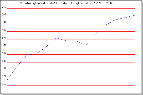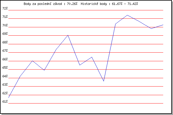 ZávodBodyVýkonnostZměna| 14.08.2013 | Atletický stadión Pod Palackého vrche | 61.67% | 61.67% | | | 28.08.2013 | Popůvky, 7.3 km | 64.21% | 63.44% | +1.77% | | 11.09.2013 | Líšeň, 11 km | 66.03% | 64.95% | +1.51% | | 18.09.2013 | Pisárky Anthropos, 6 km | 64.91% | 65.12% | +0.17% | | 21.05.2014 | Palackého vrch, 7.1 km | 67.34% | 66.02% | +0.90% | | 28.05.2014 | Obřany, 8.8 km | 69.03% | 67.18% | +1.16% | | 11.06.2014 | Popůvky, 7.9 km | 65.50% | 66.79% | -0.39% | | 16.07.2014 | Atletický stadión Pod Palackého vrche | 66.47% | 66.81% | +0.02% | | 23.07.2014 | Pisárky Anthropos, 6 km | 63.61% | 66.23% | -0.58% | | 28.09.2014 | Blažovice – Svatováclavský běh, 11 km | 70.38% | 67.56% | +1.33% | | 20.05.2015 | Palackého vrch, 7.1 km | 71.42% | 68.81% | +1.25% | | 27.05.2015 | Obřany, 8.8 km | 70.67% | 69.51% | +0.70% | | 17.06.2015 | Pisárky Anthropos, 6 km | 69.83% | 69.80% | +0.29% | | 03.08.2016 | Obřany, 8.8 km | 70.26% | 70.10% | +0.30% | | | | |