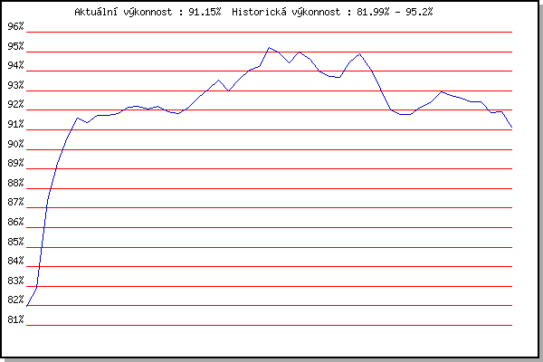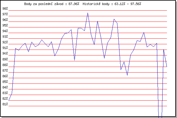 ZávodBodyVýkonnostZměna| 25.07.2007 | Pisárky Anthropos, 6.6 km | 81.99% | 81.99% | | | 01.08.2007 | Obřany, 8.8 km | 83.32% | 82.92% | +0.93% | | 14.05.2008 | Pisárky Anthropos, 6.3 km | 91.26% | 87.38% | +4.46% | | 21.05.2008 | Obřany, 8.8 km | 90.94% | 89.30% | +1.92% | | 28.05.2008 | Líšeň Mariánské údolí, 11.1 km | 91.70% | 90.62% | +1.32% | | 04.06.2008 | Veselka, Popůvky Vintrovna, 9.6 km | 92.18% | 91.62% | +1.00% | | 18.06.2008 | Obřany, 8.8 km | 90.66% | 91.38% | -0.24% | | 25.06.2008 | Běh Olympijského dne, 7.1 km | 92.39% | 91.73% | +0.35% | | 02.07.2008 | Líšeň Mariánské údolí, 11.1 km | 91.57% | 91.74% | +0.01% | | 09.07.2008 | Veselka, Popůvky Vintrovna, 7.9 km | 91.86% | 91.83% | +0.09% | | 16.07.2008 | Pisárky Anthropos, 6.3 km | 92.83% | 92.15% | +0.32% | | 06.08.2008 | Líšeň Mariánské údolí, 11.1 km | 92.13% | 92.18% | +0.03% | | 13.08.2008 | Veselka, Popůvky Vintrovna, 7.9 km | 91.55% | 92.05% | -0.13% | | 20.08.2008 | Moravská Slavia dráha, 10 km | 92.44% | 92.18% | +0.13% | | 28.09.2008 | Blažovice Svatováclavský běh, 11 km | 89.94% | 91.93% | -0.25% | | 20.05.2009 | Obřany, 8.8 km | 91.11% | 91.81% | -0.12% | | 27.05.2009 | Líšeň Mariánské údolí, 11.1 km | 92.95% | 92.14% | +0.33% | | 03.06.2009 | Veselka, Popůvky Vintrovna, 7.9 km | 93.92% | 92.65% | +0.51% | | 10.06.2009 | Pisárky Anthropos, 6.3 km | 93.99% | 93.07% | +0.42% | | 17.06.2009 | Obřany, 8.8 km | 94.60% | 93.55% | +0.48% | | 24.06.2009 | Palackého vrch Běh Olympijského dne | 89.12% | 92.97% | -0.58% | | 01.07.2009 | Líšeň Mariánské údolí, 11.1 km | 94.84% | 93.60% | +0.63% | | 08.07.2009 | Veselka, Popůvky Vintrovna, 7.9 km | 94.83% | 94.04% | +0.44% | | 15.07.2009 | Pisárky Anthropos, 6.3 km | 94.37% | 94.25% | +0.21% | | 22.07.2009 | Moravská Slavia dráha, 15 km | 97.56% | 95.20% | +0.95% | | 29.07.2009 | Obřany, 8.8 km | 93.76% | 94.95% | -0.25% | | 12.08.2009 | Veselka, Popůvky Vintrovna, 7.9 km | 91.93% | 94.40% | -0.55% | | 19.08.2009 | Moravská Slavia dráha, 10 km | 96.13% | 94.96% | +0.56% | | 02.06.2010 | Líšeň Mariánské údolí, 11.1 km | 93.04% | 94.63% | -0.33% | | 09.10.2010 | Mizuno sedmička, 7 km | 89.51% | 93.98% | -0.65% | | 27.07.2011 | Pisárky Anthropos, 6 km | 92.25% | 93.74% | -0.24% | | 10.08.2011 | Obřany, 8.8 km | 93.17% | 93.69% | -0.05% | | 17.08.2011 | AC Moravská Slávia, 10km atletický | 96.49% | 94.48% | +0.79% | | 24.08.2011 | Líšeň Mariánské údolí, 11.1 km | 95.68% | 94.89% | +0.41% | | 15.08.2012 | Atletický stadión Pod Palackého vrche | 87.43% | 94.09% | -0.80% | | 29.08.2012 | Pisárky Anthropos, 6 km | 88.87% | 93.07% | -1.02% | | 03.07.2013 | Obřany, 8.8 km | 86.46% | 92.02% | -1.05% | | 31.07.2013 | Palackého vrch, 7.1 km | 90.07% | 91.77% | -0.25% | | 07.08.2013 | Obřany, 8.8 km | 91.00% | 91.78% | +0.01% | | 14.08.2013 | Atletický stadión Pod Palackého vrche | 92.66% | 92.16% | +0.38% | | 21.08.2013 | Líšeň, 11 km | 92.48% | 92.40% | +0.24% | | 28.09.2014 | Blažovice – Svatováclavský běh, 11 km | 94.12% | 92.96% | +0.56% | | 13.05.2015 | Pisárky Anthropos, 6 km | 91.51% | 92.74% | -0.22% | | 20.05.2015 | Palackého vrch, 7.1 km | 91.95% | 92.64% | -0.10% | | 03.06.2015 | Líšeň, 11 km | 91.54% | 92.44% | -0.20% | | 22.07.2015 | Pisárky Anthropos, 6 km | 92.17% | 92.42% | -0.02% | | 19.08.2015 | Líšeň, 10.6 km | 63.12% | 91.90% | -0.52% | | 28.09.2015 | Blažovice – Svatováclavský běh, 11 km | 91.09% | 91.91% | +0.01% | | 10.08.2016 | Hotel Myslivna, 7 km | 87.96% | 91.15% | -0.76% | | | | |