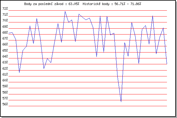 ZávodBodyVýkonnostZměna| 21.08.2013 | Líšeň, 11 km | 68.22% | 68.21% | | | 28.08.2013 | Popůvky, 7.3 km | 68.31% | 68.29% | +0.08% | | 11.09.2013 | Líšeň, 11 km | 67.12% | 67.97% | -0.32% | | 28.09.2013 | Blažovice – Svatováclavský běh, 11 km | 61.58% | 66.76% | -1.21% | | 04.06.2014 | Líšeň, 11 km | 65.35% | 66.61% | -0.15% | | 11.06.2014 | Popůvky, 7.9 km | 65.99% | 66.61% | 0.00% | | 02.07.2014 | Obřany, 8.8 km | 69.45% | 67.60% | +0.99% | | 09.07.2014 | Popůvky, 7.9 km | 66.46% | 67.39% | -0.21% | | 16.07.2014 | Atletický stadión Pod Palackého vrche | 70.65% | 68.44% | +1.05% | | 06.08.2014 | Obřany, 8.8 km | 67.36% | 68.28% | -0.16% | | 20.08.2014 | Líšeň, 11 km | 62.25% | 67.45% | -0.83% | | 27.08.2014 | Popůvky, 5.3 km | 63.96% | 66.81% | -0.64% | | 28.09.2014 | Blažovice – Svatováclavský běh, 11 km | 63.25% | 66.08% | -0.73% | | 20.05.2015 | Palackého vrch, 7.1 km | 66.59% | 66.36% | +0.28% | | 27.05.2015 | Obřany, 8.8 km | 69.82% | 67.42% | +1.06% | | 10.06.2015 | Popůvky, 7.9 km | 66.66% | 67.42% | 0.00% | | 01.07.2015 | Obřany, 8.8 km | 71.86% | 68.76% | +1.34% | | 15.07.2015 | Atletický stadión Pod Palackého vrche | 70.03% | 69.26% | +0.50% | | 22.07.2015 | Pisárky Anthropos, 6 km | 70.44% | 69.69% | +0.43% | | 29.07.2015 | Palackého vrch, 7.1 km | 66.78% | 69.12% | -0.57% | | 05.08.2015 | Obřany, 8.8 km | 71.38% | 69.82% | +0.70% | | 02.09.2015 | Atletický stadión Pod Palackého vrche | 70.86% | 70.24% | +0.42% | | 09.09.2015 | Líšeň, 11 km | 70.40% | 70.45% | +0.21% | | 28.09.2015 | Blažovice – Svatováclavský běh, 11 km | 70.71% | 70.69% | +0.24% | | 04.05.2016 | Líšeň, 11 km | 69.11% | 70.38% | -0.31% | | 18.05.2016 | Palackého vrch, 7.1 km | 64.25% | 69.66% | -0.72% | | 25.05.2016 | Obřany, 8.8 km | 71.04% | 70.23% | +0.57% | | 08.06.2016 | Popůvky, 7.9 km | 65.00% | 69.23% | -1.00% | | 15.06.2016 | Pisárky Anthropos, 6 km | 71.00% | 69.89% | +0.66% | | 17.08.2016 | Líšeň, 11 km | 67.89% | 69.63% | -0.26% | | 26.04.2017 | Pisárky Anthropos, 6 km | 68.22% | 69.46% | -0.17% | | 10.05.2017 | Popůvky, 7.9 km | 60.89% | 68.56% | -0.90% | | 14.06.2017 | Popůvky, 7.9 km | 56.71% | 67.10% | -1.46% | | 19.07.2017 | Pisárky Anthropos, 6 km | 66.61% | 67.27% | +0.17% | | 09.08.2017 | Hotel Myslivna, 7 km | 64.33% | 66.85% | -0.42% | | 30.08.2017 | Atletický stadión Pod Palackého vrche | 69.97% | 67.87% | +1.02% | | 13.09.2017 | Pisárky Anthropos, 6 km | 67.68% | 67.99% | +0.12% | | 16.05.2018 | Palackého vrch, 7.1 km | 63.13% | 67.10% | -0.89% | | 23.05.2018 | Obřany, 8.8 km | 68.85% | 67.73% | +0.63% | | 06.06.2018 | Pisárky Anthropos, 6 km | 69.48% | 68.40% | +0.67% | | 05.09.2018 | Obřany, 8.8 km | 66.38% | 68.10% | -0.30% | | 03.07.2019 | Obřany, 8.8 km | 71.13% | 69.01% | +0.91% | | 11.09.2019 | Pisárky Anthropos, 6 km | 64.74% | 68.21% | -0.80% | | 08.07.2020 | Pisárky Anthropos, 6 km | 67.51% | 68.20% | -0.01% | | 15.07.2020 | Obřany, 8.8 km | 69.10% | 68.59% | +0.39% | | 29.07.2020 | Hotel Myslivna, 7 km | 63.05% | 67.73% | -0.86% | | | | |
