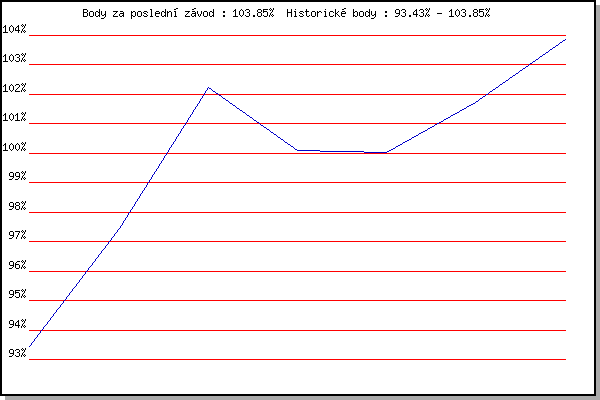 Závod| Body | Výkonnost | Změna | 14.05.2008 | Pisárky Anthropos, 6.3 km | 93.43% | 93.42% | | 28.09.2010 | Blažovice Svatováclavský běh, 9.4 km | 97.44% | 96.23% | +2.81% | 21.09.2011 | AC Moravská Slávia Brno, 1hod atlet | 102.23% | 99.62% | +3.39% | 28.09.2011 | Blažovice – Svatováclavský běh , 11 k | 100.09% | 100.20% | +0.58% | 28.09.2013 | Blažovice – Svatováclavský běh, 11 km | 100.02% | 100.33% | +0.13% | 28.09.2014 | Blažovice – Svatováclavský běh, 11 km | 101.74% | 101.00% | +0.67% | 28.09.2015 | Blažovice – Svatováclavský běh, 11 km | 103.85% | 101.98% | +0.98% | | |
