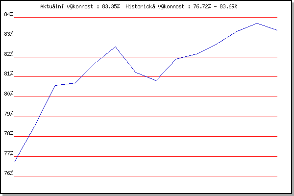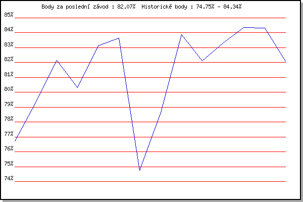 ZávodBodyVýkonnostZměna| 11.09.2013 | Líšeň, 11 km | 76.72% | 76.72% | | | 04.06.2014 | Líšeň, 11 km | 79.29% | 78.52% | +1.80% | | 28.09.2015 | Blažovice – Svatováclavský běh, 11 km | 82.15% | 80.57% | +2.05% | | 20.04.2016 | Atletický stadión Pod Palackého vrche | 80.30% | 80.70% | +0.13% | | 11.05.2016 | Popůvky, 7.9 km | 83.12% | 81.71% | +1.01% | | 25.05.2016 | Obřany, 8.8 km | 83.64% | 82.52% | +0.81% | | 01.06.2016 | Líšeň, 11 km | 74.75% | 81.23% | -1.29% | | 08.06.2016 | Popůvky, 7.9 km | 78.65% | 80.82% | -0.41% | | 29.06.2016 | Obřany, 8.8 km | 83.88% | 81.91% | +1.09% | | 24.05.2017 | Obřany, 8.8 km | 82.11% | 82.15% | +0.24% | | 07.06.2017 | Pisárky Anthropos, 6 km | 83.29% | 82.65% | +0.50% | | 30.08.2017 | Atletický stadión Pod Palackého vrche | 84.34% | 83.29% | +0.64% | | 30.05.2018 | Líšeň, 11 km | 84.32% | 83.69% | +0.40% | | 13.06.2018 | Atletický stadión Pod Palackého vrche | 82.07% | 83.35% | -0.34% | | | | |