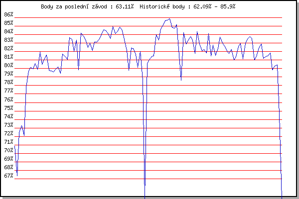 ZávodBodyVýkonnostZměna| 10.06.2009 | Pisárky Anthropos, 6.3 km | 70.85% | 70.84% | | | 17.06.2009 | Obřany, 8.8 km | 67.37% | 69.33% | -1.51% | | 24.06.2009 | Palackého vrch Běh Olympijského dne | 72.48% | 71.15% | +1.82% | | 29.07.2009 | Obřany, 8.8 km | 73.27% | 72.36% | +1.21% | | 05.08.2009 | Líšeň Mariánské údolí, 11.1 km | 72.10% | 72.42% | +0.06% | | 08.05.2010 | Běh o pohár pivovaru Černá hora, 9. | 77.80% | 74.39% | +1.97% | | 12.05.2010 | Pisárky Anthropos, 6.3 km | 79.72% | 76.26% | +1.87% | | 19.05.2010 | Palackého vrch , 7.1 km | 80.12% | 77.68% | +1.42% | | 26.05.2010 | Obřany, 8.8 km | 79.93% | 78.63% | +0.95% | | 02.06.2010 | Líšeň Mariánské údolí, 11.1 km | 80.62% | 79.51% | +0.88% | | 09.06.2010 | Veselka, Popůvky Vintrovna, 7.9 km | 79.91% | 79.91% | +0.40% | | 16.06.2010 | Pisárky Anthropos, 6.3 km | 81.98% | 80.58% | +0.67% | | 23.06.2010 | Palackého vrch Běh Olympijského dne | 80.49% | 80.62% | +0.04% | | 30.06.2010 | Obřany, 8.8 km | 81.19% | 80.81% | +0.19% | | 07.07.2010 | Líšeň Mariánské údolí, 11.1 km | 81.59% | 81.06% | +0.25% | | 14.07.2010 | Veselka, Popůvky Vintrovna, 7.9 km | 79.76% | 80.80% | -0.26% | | 28.07.2010 | Pisárky Anthropos, 6.3 km | 79.75% | 80.59% | -0.21% | | 04.08.2010 | Palackého vrch , 7.1 km | 79.63% | 80.41% | -0.18% | | 11.08.2010 | Obřany, 8.8 km | 79.93% | 80.33% | -0.08% | | 18.08.2010 | Moravská Slavia dráha, 10 km | 80.22% | 80.33% | 0.00% | | 01.09.2010 | Veselka, Popůvky Vintrovna, 7.9 km | 79.42% | 80.19% | -0.14% | | 08.09.2010 | Pisárky Anthropos, 6.3 km | 81.74% | 80.62% | +0.43% | | 22.09.2010 | Moravská Slavia dráha, 15 km | 81.41% | 80.86% | +0.24% | | 28.09.2010 | Blažovice Svatováclavský běh, 9.4 km | 81.09% | 80.98% | +0.12% | | 11.05.2011 | Pisárky Anthropos, 6 km | 83.63% | 81.71% | +0.73% | | 18.05.2011 | Palackého vrch, 7.1 km | 83.39% | 82.23% | +0.52% | | 25.05.2011 | Obřany, 8.8 km | 82.03% | 82.28% | +0.05% | | 01.06.2011 | Líšeň Mariánské údolí, 11.1 km | 83.33% | 82.63% | +0.35% | | 08.06.2011 | Veselka, Popůvky Vintrovna, 7.9 km | 79.84% | 82.12% | -0.51% | | 15.06.2011 | Pisárky Anthropos, 6 km | 84.15% | 82.75% | +0.63% | | 23.06.2011 | Palackého vrch – Běh Olympijského dne | 83.85% | 83.16% | +0.41% | | 29.06.2011 | Obřany, 8.8 km | 83.41% | 83.34% | +0.18% | | 13.07.2011 | Popůvky, 7.9 km | 82.47% | 83.22% | -0.12% | | 20.07.2011 | AC Moravská Slávia, 5km atletický o | 83.00% | 83.23% | +0.01% | | 27.07.2011 | Pisárky Anthropos, 6 km | 82.13% | 83.01% | -0.22% | | 03.08.2011 | Palackého vrch, 7.1 km | 83.10% | 83.08% | +0.07% | | 10.08.2011 | Obřany, 8.8 km | 83.14% | 83.14% | +0.06% | | 17.08.2011 | AC Moravská Slávia, 10km atletický | 83.46% | 83.27% | +0.13% | | 24.08.2011 | Líšeň Mariánské údolí, 11.1 km | 84.03% | 83.50% | +0.23% | | 07.09.2011 | Pisárky Anthropos, 6 km | 84.61% | 83.80% | +0.30% | | 14.09.2011 | Líšeň Mariánské údolí, 11.1 km | 84.49% | 84.01% | +0.21% | | 21.09.2011 | AC Moravská Slávia Brno, 1hod atlet | 84.08% | 84.07% | +0.06% | | 28.09.2011 | Blažovice – Svatováclavský běh , 11 k | 83.52% | 83.98% | -0.09% | | 09.05.2012 | Pisárky Anthropos, 6 km | 84.93% | 84.25% | +0.27% | | 16.05.2012 | Palackého vrch, 7.1 km | 84.14% | 84.26% | +0.01% | | 23.05.2012 | Obřany, 8.8 km | 84.38% | 84.33% | +0.07% | | 30.05.2012 | Líšeň Mariánské údolí, 11 km | 84.90% | 84.51% | +0.18% | | 06.06.2012 | Popůvky, 7.9 km | 84.56% | 84.55% | +0.04% | | 13.06.2012 | Pisárky Anthropos, 6 km | 83.41% | 84.35% | -0.20% | | 20.06.2012 | Palackého vrch – Běh Olympijského dne | 82.15% | 84.13% | -0.22% | | 27.06.2012 | Obřany, 8.8 km | 79.78% | 83.73% | -0.40% | | 11.07.2012 | Popůvky, 7.9 km | 82.44% | 83.49% | -0.24% | | 18.07.2012 | Atletický stadión Pod Palackého vrche | 82.35% | 83.28% | -0.21% | | 25.07.2012 | Pisárky Anthropos, 6 km | 81.64% | 82.98% | -0.30% | | 01.08.2012 | Palackého vrch, 7.1 km | 80.12% | 82.57% | -0.41% | | 08.08.2012 | Obřany, 8.8 km | 82.01% | 82.55% | -0.02% | | 22.08.2012 | Líšeň Mariánské údolí, 11 km | 78.60% | 82.04% | -0.51% | | 29.08.2012 | Pisárky Anthropos, 6 km | 62.09% | 81.37% | -0.67% | | 05.09.2012 | Popůvky, 7.9 km | 80.62% | 81.31% | -0.06% | | 12.09.2012 | Líšeň Mariánské údolí, 11 km | 81.03% | 81.38% | +0.07% | | 19.09.2012 | Atletický stadión Pod Palackého vrche | 81.41% | 81.50% | +0.12% | | 28.09.2012 | Blažovice – Svatováclavský běh, 11 km | 81.51% | 81.57% | +0.07% | | 15.05.2013 | Pisárky Anthropos, 6 km | 84.02% | 82.24% | +0.67% | | 22.05.2013 | Palackého vrch, 7.1 km | 83.37% | 82.61% | +0.37% | | 29.05.2013 | Obřany, 8.8 km | 84.64% | 83.20% | +0.59% | | 05.06.2013 | Líšeň, 11 km | 85.14% | 83.78% | +0.58% | | 12.06.2013 | Popůvky, 7.3 km | 85.67% | 84.37% | +0.59% | | 19.06.2013 | Pisárky Anthropos, 6 km | 85.71% | 84.85% | +0.48% | | 26.06.2013 | Palackého vrch – Běh Olympijského dne | 85.90% | 85.25% | +0.40% | | 03.07.2013 | Obřany, 8.8 km | 84.85% | 85.24% | -0.01% | | 10.07.2013 | Popůvky, 7.3 km | 84.79% | 85.20% | -0.04% | | 17.07.2013 | Atletický stadión Pod Palackého vrche | 85.15% | 85.22% | +0.02% | | 24.07.2013 | Pisárky Anthropos, 6 km | 81.52% | 84.74% | -0.48% | | 31.07.2013 | Palackého vrch, 7.1 km | 78.60% | 84.05% | -0.69% | | 07.08.2013 | Obřany, 8.8 km | 84.23% | 84.26% | +0.21% | | 21.08.2013 | Líšeň, 11 km | 82.90% | 84.06% | -0.20% | | 28.08.2013 | Popůvky, 7.3 km | 83.31% | 84.00% | -0.06% | | 04.09.2013 | Atletický stadión Pod Palackého vrche | 83.76% | 84.01% | +0.01% | | 11.09.2013 | Líšeň, 11 km | 83.30% | 83.89% | -0.12% | | 18.09.2013 | Pisárky Anthropos, 6 km | 81.79% | 83.54% | -0.35% | | 28.09.2013 | Blažovice – Svatováclavský běh, 11 km | 84.37% | 83.83% | +0.29% | | 14.05.2014 | Pisárky Anthropos, 6 km | 82.88% | 83.70% | -0.13% | | 21.05.2014 | Palackého vrch, 7.1 km | 82.08% | 83.38% | -0.32% | | 28.05.2014 | Obřa