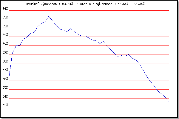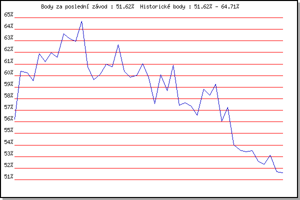 ZávodBodyVýkonnostZměna| 25.07.2006 | Veselka Popůvky Vintrovna, 7.9 km | 56.23% | 56.23% | | | 06.06.2007 | Veselka, Popůvky Vintrovna, 7.9 km | 60.37% | 59.14% | +2.91% | | 13.06.2007 | Pisárky Anthropos, 6.6 km | 60.25% | 60.00% | +0.86% | | 20.06.2007 | Palackého vrch Běh Olympijského dne | 59.56% | 60.02% | +0.02% | | 27.06.2007 | Obřany, 8.8 km | 61.89% | 60.75% | +0.73% | | 04.07.2007 | Líšeň Mariánské údolí, 11.1 km | 61.20% | 60.98% | +0.23% | | 11.07.2007 | Veselka, Popůvky Vintrovna, 7.9 km | 61.99% | 61.39% | +0.41% | | 25.07.2007 | Pisárky Anthropos, 6.6 km | 61.57% | 61.51% | +0.12% | | 01.08.2007 | Obřany, 8.8 km | 63.63% | 62.20% | +0.69% | | 08.08.2007 | Líšeň Mariánské údolí, 11.1 km | 63.20% | 62.55% | +0.35% | | 15.08.2007 | Moravská Slávia dráha, 10 km | 62.97% | 62.74% | +0.19% | | 28.09.2007 | Blažovice Svatováclavský běh, 11 km | 64.71% | 63.34% | +0.60% | | 16.07.2008 | Pisárky Anthropos, 6.3 km | 60.75% | 62.86% | -0.48% | | 23.07.2008 | Moravská Slavia , 15 km | 59.66% | 62.35% | -0.51% | | 30.07.2008 | Obřany, 8.8 km | 60.12% | 61.91% | -0.44% | | 06.08.2008 | Líšeň Mariánské údolí, 11.1 km | 60.99% | 61.77% | -0.14% | | 20.08.2008 | Moravská Slavia dráha, 10 km | 60.75% | 61.59% | -0.18% | | 28.09.2008 | Blažovice Svatováclavský běh, 11 km | 62.65% | 61.94% | +0.35% | | 10.06.2009 | Pisárky Anthropos, 6.3 km | 60.39% | 61.63% | -0.31% | | 17.06.2009 | Obřany, 8.8 km | 59.87% | 61.32% | -0.31% | | 24.06.2009 | Palackého vrch Běh Olympijského dne | 60.05% | 61.07% | -0.25% | | 01.07.2009 | Líšeň Mariánské údolí, 11.1 km | 61.04% | 61.11% | +0.04% | | 08.07.2009 | Veselka, Popůvky Vintrovna, 7.9 km | 59.82% | 60.87% | -0.24% | | 22.07.2009 | Moravská Slavia dráha, 15 km | 57.57% | 60.65% | -0.22% | | 05.08.2009 | Líšeň Mariánské údolí, 11.1 km | 60.07% | 60.56% | -0.09% | | 12.08.2009 | Veselka, Popůvky Vintrovna, 7.9 km | 58.67% | 60.22% | -0.34% | | 28.09.2009 | Blažovice Svatováclavský běh, 11 km | 60.91% | 60.47% | +0.25% | | 19.05.2010 | Palackého vrch , 7.1 km | 57.42% | 60.00% | -0.47% | | 26.05.2010 | Obřany, 8.8 km | 57.67% | 59.55% | -0.45% | | 09.06.2010 | Veselka, Popůvky Vintrovna, 7.9 km | 57.35% | 59.14% | -0.41% | | 16.06.2010 | Pisárky Anthropos, 6.3 km | 56.59% | 58.78% | -0.36% | | 23.06.2010 | Palackého vrch Běh Olympijského dne | 58.82% | 58.86% | +0.08% | | 07.07.2010 | Líšeň Mariánské údolí, 11.1 km | 58.31% | 58.80% | -0.06% | | 14.07.2010 | Veselka, Popůvky Vintrovna, 7.9 km | 59.24% | 58.98% | +0.18% | | 21.07.2010 | Moravská Slavia dráha, 5 km | 56.05% | 58.58% | -0.40% | | 28.07.2010 | Pisárky Anthropos, 6.3 km | 57.25% | 58.35% | -0.23% | | 03.08.2011 | Palackého vrch, 7.1 km | 54.04% | 57.92% | -0.43% | | 10.08.2011 | Obřany, 8.8 km | 53.56% | 57.17% | -0.75% | | 31.08.2011 | Popůvky, 7.9 km | 53.41% | 56.46% | -0.71% | | 07.09.2011 | Pisárky Anthropos, 6 km | 53.51% | 55.88% | -0.58% | | 13.06.2012 | Pisárky Anthropos, 6 km | 52.59% | 55.40% | -0.48% | | 20.06.2012 | Palackého vrch – Běh Olympijského dne | 52.35% | 54.85% | -0.55% | | 27.06.2012 | Obřany, 8.8 km | 53.11% | 54.53% | -0.32% | | 25.07.2012 | Pisárky Anthropos, 6 km | 51.68% | 54.11% | -0.42% | | 01.08.2012 | Palackého vrch, 7.1 km | 51.62% | 53.64% | -0.47% | | | | |