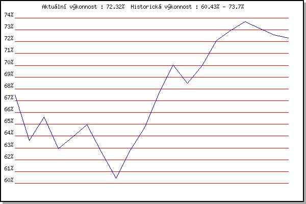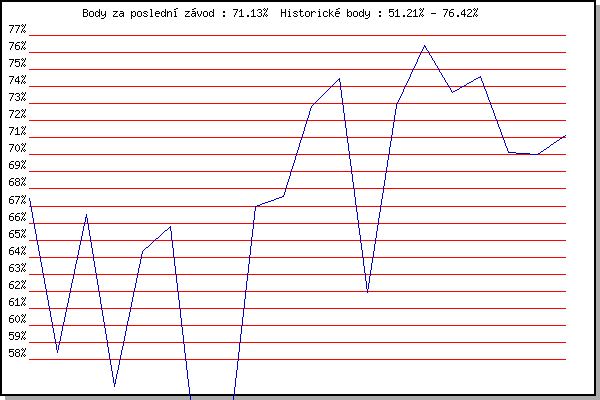 ZávodBodyVýkonnostZměna| 14.05.2014 | Pisárky Anthropos, 6 km | 67.46% | 67.46% | | | 02.07.2014 | Obřany, 8.8 km | 58.43% | 63.61% | -3.85% | | 17.09.2014 | Pisárky Anthropos, 6 km | 66.53% | 65.62% | +2.01% | | 13.05.2015 | Pisárky Anthropos, 6 km | 56.42% | 62.95% | -2.67% | | 27.05.2015 | Obřany, 8.8 km | 64.34% | 63.93% | +0.98% | | 17.06.2015 | Pisárky Anthropos, 6 km | 65.81% | 64.98% | +1.05% | | 01.07.2015 | Obřany, 8.8 km | 51.21% | 62.68% | -2.30% | | 15.07.2015 | Atletický stadión Pod Palackého vrche | 52.46% | 60.43% | -2.25% | | 02.09.2015 | Atletický stadión Pod Palackého vrche | 66.95% | 62.80% | +2.37% | | 28.09.2015 | Blažovice – Svatováclavský běh, 11 km | 67.57% | 64.69% | +1.89% | | 27.04.2016 | Pisárky Anthropos, 6 km | 72.85% | 67.60% | +2.91% | | 04.05.2016 | Líšeň, 11 km | 74.47% | 70.04% | +2.44% | | 25.05.2016 | Obřany, 8.8 km | 61.91% | 68.45% | -1.59% | | 29.06.2016 | Obřany, 8.8 km | 72.91% | 69.96% | +1.51% | | 27.07.2016 | Palackého vrch, 7.1 km | 76.42% | 72.08% | +2.12% | | 31.08.2016 | Atletický stadión Pod Palackého vrche | 73.63% | 72.94% | +0.86% | | 07.09.2016 | Pisárky Anthropos, 6 km | 74.57% | 73.70% | +0.76% | | 25.04.2018 | Atletický stadión Pod Palackého vrche | 70.15% | 73.13% | -0.57% | | 23.05.2018 | Obřany, 8.8 km | 70.02% | 72.55% | -0.58% | | 05.09.2018 | Obřany, 8.8 km | 71.13% | 72.32% | -0.23% | | | | |
