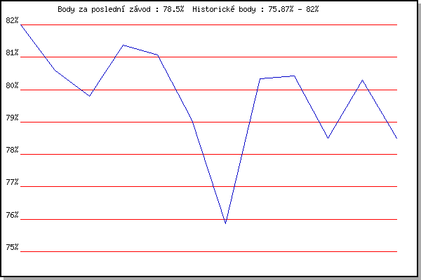 ZávodBodyVýkonnostZměna| 14.05.2014 | Pisárky Anthropos, 6 km | 82.00% | 82.00% | | | 11.06.2014 | Popůvky, 7.9 km | 80.60% | 81.38% | -0.62% | | 16.07.2014 | Atletický stadión Pod Palackého vrche | 79.79% | 80.85% | -0.53% | | 23.07.2014 | Pisárky Anthropos, 6 km | 81.37% | 81.17% | +0.32% | | 30.07.2014 | Palackého vrch, 7.1 km | 81.06% | 81.22% | +0.05% | | 27.05.2015 | Obřany, 8.8 km | 79.06% | 80.78% | -0.44% | | 10.06.2015 | Popůvky, 7.9 km | 75.87% | 80.14% | -0.64% | | 24.06.2015 | Palackého vrch, 7.1 km | 80.34% | 80.42% | +0.28% | | 29.07.2015 | Palackého vrch, 7.1 km | 80.42% | 80.50% | +0.08% | | 12.08.2015 | Atletický stadión Pod Palackého vrche | 78.50% | 80.08% | -0.42% | | 15.06.2016 | Pisárky Anthropos, 6 km | 80.29% | 80.22% | +0.14% | | 09.05.2018 | Popůvky, 7.9 km | 78.50% | 79.86% | -0.36% | | | | |