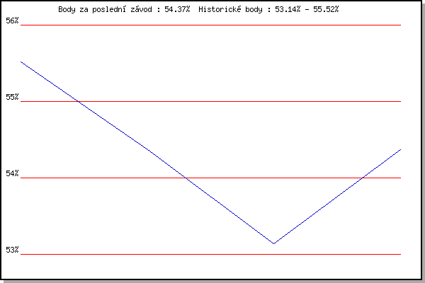 Závod| Body | Výkonnost | Změna | 14.05.2014 | Pisárky Anthropos, 6 km | 55.52% | 55.52% | | 21.05.2014 | Palackého vrch, 7.1 km | 54.37% | 55.02% | -0.50% | 30.07.2014 | Palackého vrch, 7.1 km | 53.14% | 54.43% | -0.59% | 27.08.2014 | Popůvky, 5.3 km | 54.37% | 54.52% | +0.09% | | |