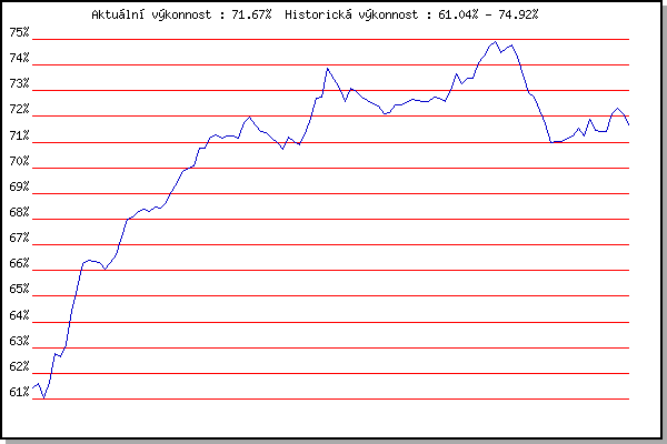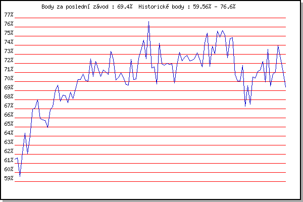 ZávodBodyVýkonnostZměna| 21.05.2014 | Palackého vrch, 7.1 km | 61.45% | 61.45% | | | 28.05.2014 | Obřany, 8.8 km | 61.64% | 61.59% | +0.14% | | 18.06.2014 | Pisárky Anthropos, 6 km | 59.56% | 61.04% | -0.55% | | 25.06.2014 | Palackého vrch – Běh Olympijského dne | 62.18% | 61.64% | +0.60% | | 02.07.2014 | Obřany, 8.8 km | 64.35% | 62.79% | +1.15% | | 09.07.2014 | Popůvky, 7.9 km | 62.06% | 62.63% | -0.16% | | 23.07.2014 | Pisárky Anthropos, 6 km | 64.02% | 63.14% | +0.51% | | 06.08.2014 | Obřany, 8.8 km | 66.95% | 64.40% | +1.26% | | 13.08.2014 | Atletický stadión Pod Palackého vrche | 67.13% | 65.33% | +0.93% | | 20.08.2014 | Líšeň, 11 km | 68.01% | 66.26% | +0.93% | | 10.09.2014 | Líšeň, 11 km | 65.96% | 66.40% | +0.14% | | 17.09.2014 | Pisárky Anthropos, 6 km | 65.78% | 66.37% | -0.03% | | 28.09.2014 | Blažovice – Svatováclavský běh, 11 km | 65.72% | 66.32% | -0.05% | | 13.05.2015 | Pisárky Anthropos, 6 km | 64.97% | 66.05% | -0.27% | | 20.05.2015 | Palackého vrch, 7.1 km | 66.88% | 66.32% | +0.27% | | 27.05.2015 | Obřany, 8.8 km | 67.25% | 66.63% | +0.31% | | 03.06.2015 | Líšeň, 11 km | 69.02% | 67.32% | +0.69% | | 10.06.2015 | Popůvky, 7.9 km | 69.61% | 67.99% | +0.67% | | 24.06.2015 | Palackého vrch, 7.1 km | 67.86% | 68.07% | +0.08% | | 01.07.2015 | Obřany, 8.8 km | 68.52% | 68.29% | +0.22% | | 08.07.2015 | Popůvky, 7.9 km | 68.45% | 68.40% | +0.11% | | 15.07.2015 | Atletický stadión Pod Palackého vrche | 67.67% | 68.29% | -0.11% | | 22.07.2015 | Pisárky Anthropos, 6 km | 68.85% | 68.48% | +0.19% | | 12.08.2015 | Atletický stadión Pod Palackého vrche | 68.12% | 68.43% | -0.05% | | 20.04.2016 | Atletický stadión Pod Palackého vrche | 69.14% | 68.64% | +0.21% | | 27.04.2016 | Pisárky Anthropos, 6 km | 70.23% | 69.09% | +0.45% | | 04.05.2016 | Líšeň, 11 km | 70.23% | 69.43% | +0.34% | | 11.05.2016 | Popůvky, 7.9 km | 70.81% | 69.84% | +0.41% | | 18.05.2016 | Palackého vrch, 7.1 km | 70.10% | 69.99% | +0.15% | | 25.05.2016 | Obřany, 8.8 km | 70.03% | 70.07% | +0.08% | | 08.06.2016 | Popůvky, 7.9 km | 72.52% | 70.75% | +0.68% | | 15.06.2016 | Pisárky Anthropos, 6 km | 70.57% | 70.78% | +0.03% | | 22.06.2016 | Palackého vrch Běh Olympijského dne | 72.20% | 71.18% | +0.40% | | 29.06.2016 | Obřany, 8.8 km | 71.36% | 71.28% | +0.10% | | 13.07.2016 | Atletický stadión Pod Palackého vrche | 70.57% | 71.16% | -0.12% | | 20.07.2016 | Pisárky Anthropos, 6 km | 71.26% | 71.24% | +0.08% | | 03.08.2016 | Obřany, 8.8 km | 71.08% | 71.24% | 0.00% | | 17.08.2016 | Líšeň, 11 km | 70.79% | 71.16% | -0.08% | | 24.08.2016 | Popůvky, 7.9 km | 73.33% | 71.74% | +0.58% | | 31.08.2016 | Atletický stadión Pod Palackého vrche | 72.42% | 71.97% | +0.23% | | 07.09.2016 | Pisárky Anthropos, 6 km | 70.17% | 71.65% | -0.32% | | 26.04.2017 | Pisárky Anthropos, 6 km | 70.42% | 71.42% | -0.23% | | 03.05.2017 | Hotel Myslivna, 7 km | 70.94% | 71.36% | -0.06% | | 17.05.2017 | Palackého vrch, 7.1 km | 70.43% | 71.17% | -0.19% | | 24.05.2017 | Obřany, 8.8 km | 69.69% | 70.98% | -0.19% | | 31.05.2017 | Líšeň, 11 km | 69.62% | 70.72% | -0.26% | | 07.06.2017 | Pisárky Anthropos, 6 km | 72.42% | 71.20% | +0.48% | | 28.06.2017 | Obřany, 8.8 km | 70.20% | 71.03% | -0.17% | | 12.07.2017 | Atletický stadión Pod Palackého vrche | 70.25% | 70.89% | -0.14% | | 19.07.2017 | Pisárky Anthropos, 6 km | 72.55% | 71.34% | +0.45% | | 02.08.2017 | Líšeň, 11 km | 73.49% | 71.94% | +0.60% | | 09.08.2017 | Hotel Myslivna, 7 km | 74.56% | 72.69% | +0.75% | | 16.08.2017 | Obřany, 8.8 km | 72.49% | 72.76% | +0.07% | | 23.08.2017 | Popůvky, 7.9 km | 76.60% | 73.86% | +1.10% | | 06.09.2017 | Líšeň, 11 km | 71.50% | 73.44% | -0.42% | | 13.09.2017 | Pisárky Anthropos, 6 km | 71.61% | 73.09% | -0.35% | | 25.04.2018 | Atletický stadión Pod Palackého vrche | 69.70% | 72.56% | -0.53% | | 02.05.2018 | Hotel Myslivna, 7 km | 74.22% | 73.11% | +0.55% | | 16.05.2018 | Palackého vrch, 7.1 km | 71.95% | 72.96% | -0.15% | | 23.05.2018 | Obřany, 8.8 km | 71.76% | 72.75% | -0.21% | | 30.05.2018 | Líšeň, 11 km | 71.99% | 72.62% | -0.13% | | 06.06.2018 | Pisárky Anthropos, 6 km | 71.86% | 72.48% | -0.14% | | 13.06.2018 | Atletický stadión Pod Palackého vrche | 71.97% | 72.39% | -0.09% | | 27.06.2018 | Popůvky, 7.9 km | 69.84% | 72.10% | -0.29% | | 18.07.2018 | Obřany, 8.8 km | 71.84% | 72.15% | +0.05% | | 25.07.2018 | Líšeň, 11 km | 73.22% | 72.46% | +0.31% | | 01.08.2018 | Pisárky Anthropos, 6 km | 72.30% | 72.46% | 0.00% | | 15.08.2018 | Popůvky, 7.9 km | 72.66% | 72.54% | +0.08% | | 22.08.2018 | Palackého vrch, 7.1 km | 72.89% | 72.66% | +0.12% | | 29.08.2018 | Atletický stadión Pod Palackého vrche | 72.25% | 72.60% | -0.06% | | 05.09.2018 | Obřany, 8.8 km | 72.32% | 72.56% | -0.04% | | 24.04.2019 | Pisárky Anthropos, 6 km | 72.55% | 72.58% | +0.02% | | 15.05.2019 | Kociánka, 3.2 km | 73.17% | 72.75% | +0.17% | | 22.05.2019 | Obřany, 8.8 km | 72.46% | 72.70% | -0.05% | | 29.05.2019 | Líšeň, 11 km | 71.59% | 72.56% | -0.14% | | 05.06.2019 | Palackého vrch, 7.1 km | 74.21% | 73.01% | +0.45% | | 12.06.2019 | Popůvky, 7.9 km | 75.32% | 73.65% | +0.64% | | 19.06.2019 | Atletický stadión Pod Palackého vrche | 71.64% | 73.27% | -0.38% | | 26.06.2019 | Pisárky Anthropos, 6 km | 73.87% | 73.50% | +0.23% | | 03.07.2019 | Obřany, 8.8 km | 73.05% | 73.48% | -0.02% | | 10.07.2019 | Hotel Myslivna, 7 km | 75.57% | 74.07% | +0.59% | | 31.07.2019 | Popůvky, 7.9 km | 74.86% | 74.36% | +0.29% | | 07.08.2019 | Hotel Myslivna, 7 km | 75.59% | 74.75% | +0.39% | | 14.08.2019 | Palackého vrch, 7.1 km | 75.09% | 74.92% | +0.17% | | 21.08.2019 | Atletický stadión Pod Palackého vrche | 72.60% | 74.48% | -0.44% | | 28.08.2019 | Obřany, 8.8 km | 74.73% | 74.64% | +0.16% | | 04.09.2019 | Hotel Myslivna, 7 km | 74.83% | 74.79% | +0.15% | | 01.07.2020 | Atletický stadión Pod Palackého vrche | 70.75% | 74.30% | -0.49% | | 08.07.2020 | Pisárky Anthropo