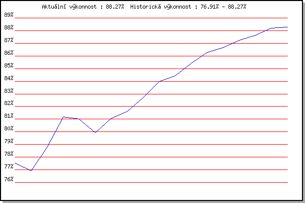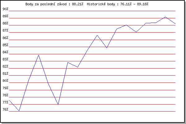 ZávodBodyVýkonnostZměna| 21.05.2014 | Palackého vrch, 7.1 km | 77.54% | 77.54% | | | 28.05.2014 | Obřany, 8.8 km | 76.11% | 76.91% | -0.63% | | 13.05.2015 | Pisárky Anthropos, 6 km | 80.37% | 78.78% | +1.87% | | 20.05.2015 | Palackého vrch, 7.1 km | 83.86% | 81.18% | +2.40% | | 27.04.2016 | Pisárky Anthropos, 6 km | 79.91% | 81.00% | -0.18% | | 11.05.2016 | Popůvky, 7.9 km | 76.94% | 79.94% | -1.06% | | 03.08.2016 | Obřany, 8.8 km | 82.83% | 81.05% | +1.11% | | 24.08.2016 | Popůvky, 7.9 km | 82.19% | 81.63% | +0.58% | | 07.09.2016 | Pisárky Anthropos, 6 km | 84.53% | 82.72% | +1.09% | | 23.05.2018 | Obřany, 8.8 km | 86.63% | 83.99% | +1.27% | | 13.06.2018 | Atletický stadión Pod Palackého vrche | 84.86% | 84.44% | +0.45% | | 27.06.2018 | Popůvky, 7.9 km | 87.47% | 85.42% | +0.98% | | 18.07.2018 | Obřany, 8.8 km | 88.04% | 86.28% | +0.86% | | 01.08.2018 | Pisárky Anthropos, 6 km | 87.04% | 86.66% | +0.38% | | 05.09.2018 | Obřany, 8.8 km | 88.33% | 87.23% | +0.57% | | 12.09.2018 | Pisárky Anthropos, 6 km | 88.37% | 87.65% | +0.42% | | 24.04.2019 | Pisárky Anthropos, 6 km | 89.18% | 88.19% | +0.54% | | 28.08.2019 | Obřany, 8.8 km | 88.21% | 88.27% | +0.08% | | | | |