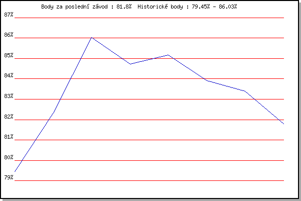 Závod| Body | Výkonnost | Změna | 28.05.2014 | Obřany, 8.8 km | 79.45% | 79.45% | | 04.06.2014 | Líšeň, 11 km | 82.33% | 81.46% | +2.01% | 11.06.2014 | Popůvky, 7.9 km | 86.03% | 84.03% | +2.57% | 18.06.2014 | Pisárky Anthropos, 6 km | 84.72% | 84.60% | +0.57% | 02.07.2014 | Obřany, 8.8 km | 85.16% | 84.98% | +0.38% | 09.07.2014 | Popůvky, 7.9 km | 83.91% | 84.79% | -0.19% | 06.08.2014 | Obřany, 8.8 km | 83.40% | 84.45% | -0.34% | 13.08.2014 | Atletický stadión Pod Palackého vrche | 81.80% | 83.93% | -0.52% | | |