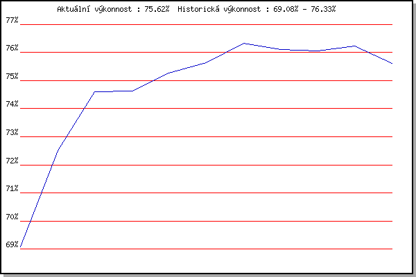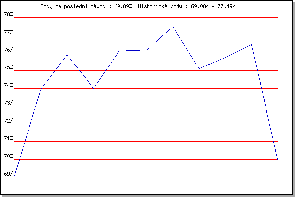 ZávodBodyVýkonnostZměna| 28.05.2014 | Obřany, 8.8 km | 69.08% | 69.08% | | | 04.06.2014 | Líšeň, 11 km | 73.97% | 72.51% | +3.43% | | 18.06.2014 | Pisárky Anthropos, 6 km | 75.90% | 74.60% | +2.09% | | 25.06.2014 | Palackého vrch – Běh Olympijského dne | 74.00% | 74.64% | +0.04% | | 02.07.2014 | Obřany, 8.8 km | 76.16% | 75.26% | +0.62% | | 09.07.2014 | Popůvky, 7.9 km | 76.10% | 75.63% | +0.37% | | 16.07.2014 | Atletický stadión Pod Palackého vrche | 77.49% | 76.33% | +0.70% | | 06.08.2014 | Obřany, 8.8 km | 75.12% | 76.11% | -0.22% | | 20.08.2014 | Líšeň, 11 km | 75.76% | 76.07% | -0.04% | | 01.07.2015 | Obřany, 8.8 km | 76.47% | 76.24% | +0.17% | | 25.05.2016 | Obřany, 8.8 km | 69.89% | 75.62% | -0.62% | | | | |