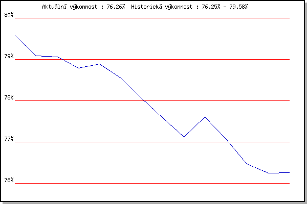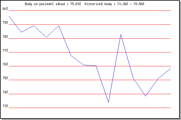 ZávodBodyVýkonnostZměna| 14.06.2006 | Veselka, Popůvky Vintrovna, 7.9 km | 79.58% | 79.58% | | | 25.07.2006 | Veselka Popůvky Vintrovna, 7.9 km | 78.45% | 79.08% | -0.50% | | 28.05.2008 | Líšeň Mariánské údolí, 11.1 km | 78.91% | 79.06% | -0.02% | | 11.06.2008 | Pisárky Anthropos, 6.3 km | 78.08% | 78.79% | -0.27% | | 18.06.2008 | Obřany, 8.8 km | 78.91% | 78.89% | +0.10% | | 08.05.2009 | Běh o pohár pivovaru Černá hora, 9. | 76.75% | 78.56% | -0.33% | | 13.05.2009 | Pisárky Anthropos, 6.3 km | 76.09% | 78.06% | -0.50% | | 10.06.2009 | Pisárky Anthropos, 6.3 km | 76.02% | 77.58% | -0.48% | | 17.06.2009 | Obřany, 8.8 km | 73.38% | 77.13% | -0.45% | | 24.06.2009 | Palackého vrch Běh Olympijského dne | 78.30% | 77.60% | +0.47% | | 26.05.2010 | Obřany, 8.8 km | 75.13% | 77.08% | -0.52% | | 09.06.2010 | Veselka, Popůvky Vintrovna, 7.9 km | 73.85% | 76.47% | -0.61% | | 28.07.2010 | Pisárky Anthropos, 6.3 km | 75.11% | 76.25% | -0.22% | | 04.08.2010 | Palackého vrch , 7.1 km | 75.83% | 76.26% | +0.01% | | | | |