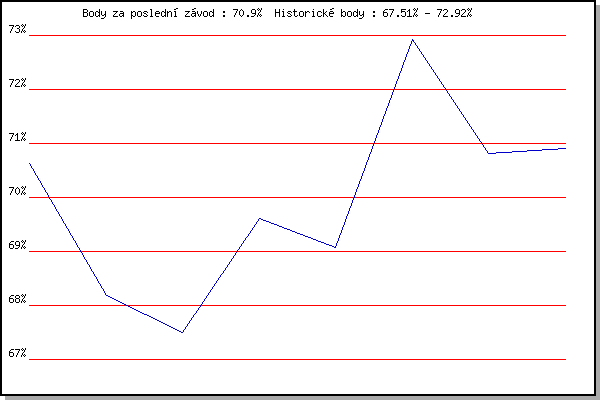 Závod| Body | Výkonnost | Změna | 18.06.2014 | Pisárky Anthropos, 6 km | 70.63% | 70.63% | | 13.08.2014 | Atletický stadión Pod Palackého vrche | 68.18% | 69.55% | -1.08% | 28.09.2014 | Blažovice – Svatováclavský běh, 11 km | 67.51% | 68.82% | -0.73% | 27.05.2015 | Obřany, 8.8 km | 69.61% | 69.27% | +0.45% | 17.06.2015 | Pisárky Anthropos, 6 km | 69.07% | 69.32% | +0.05% | 24.06.2015 | Palackého vrch, 7.1 km | 72.92% | 70.63% | +1.31% | 15.07.2015 | Atletický stadión Pod Palackého vrche | 70.82% | 70.83% | +0.20% | 09.09.2015 | Líšeň, 11 km | 70.90% | 70.95% | +0.12% | | |