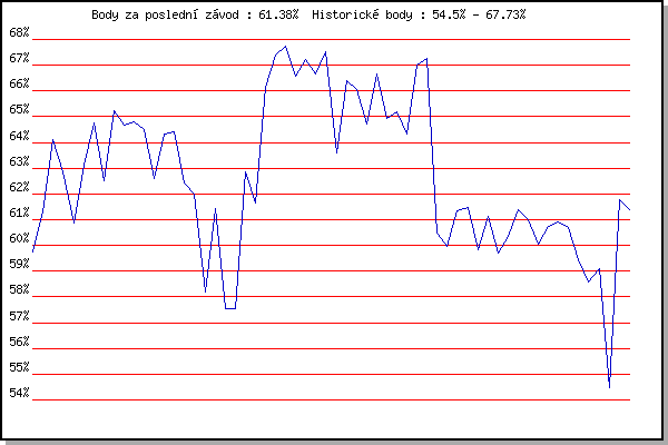 ZávodBodyVýkonnostZměna| 18.06.2014 | Pisárky Anthropos, 6 km | 59.74% | 59.74% | | | 25.06.2014 | Palackého vrch – Běh Olympijského dne | 61.32% | 60.84% | +1.10% | | 02.07.2014 | Obřany, 8.8 km | 64.10% | 62.64% | +1.80% | | 09.07.2014 | Popůvky, 7.9 km | 62.84% | 62.91% | +0.27% | | 16.07.2014 | Atletický stadión Pod Palackého vrche | 60.86% | 62.32% | -0.59% | | 23.07.2014 | Pisárky Anthropos, 6 km | 63.12% | 62.69% | +0.37% | | 30.07.2014 | Palackého vrch, 7.1 km | 64.76% | 63.47% | +0.78% | | 06.08.2014 | Obřany, 8.8 km | 62.52% | 63.32% | -0.15% | | 13.08.2014 | Atletický stadión Pod Palackého vrche | 65.25% | 63.97% | +0.65% | | 20.08.2014 | Líšeň, 11 km | 64.69% | 64.25% | +0.28% | | 27.08.2014 | Popůvky, 5.3 km | 64.81% | 64.50% | +0.25% | | 03.09.2014 | Atletický stadión Pod Palackého vrche | 64.49% | 64.59% | +0.09% | | 10.09.2014 | Líšeň, 11 km | 62.61% | 64.19% | -0.40% | | 17.09.2014 | Pisárky Anthropos, 6 km | 64.33% | 64.30% | +0.11% | | 28.09.2014 | Blažovice – Svatováclavský běh, 11 km | 64.41% | 64.41% | +0.11% | | 13.05.2015 | Pisárky Anthropos, 6 km | 62.41% | 64.04% | -0.37% | | 20.05.2015 | Palackého vrch, 7.1 km | 62.00% | 63.69% | -0.35% | | 01.07.2015 | Obřany, 8.8 km | 58.21% | 63.30% | -0.39% | | 08.07.2015 | Popůvky, 7.9 km | 61.42% | 62.95% | -0.35% | | 15.07.2015 | Atletický stadión Pod Palackého vrche | 57.54% | 62.12% | -0.83% | | 22.07.2015 | Pisárky Anthropos, 6 km | 57.53% | 61.23% | -0.89% | | 29.07.2015 | Palackého vrch, 7.1 km | 62.86% | 61.82% | +0.59% | | 26.08.2015 | Popůvky, 7.9 km | 61.64% | 61.98% | +0.16% | | 20.04.2016 | Atletický stadión Pod Palackého vrche | 66.14% | 63.25% | +1.27% | | 27.04.2016 | Pisárky Anthropos, 6 km | 67.38% | 64.52% | +1.27% | | 04.05.2016 | Líšeň, 11 km | 67.73% | 65.49% | +0.97% | | 11.05.2016 | Popůvky, 7.9 km | 66.55% | 65.94% | +0.45% | | 18.05.2016 | Palackého vrch, 7.1 km | 67.23% | 66.47% | +0.53% | | 25.05.2016 | Obřany, 8.8 km | 66.64% | 66.70% | +0.23% | | 01.06.2016 | Líšeň, 11 km | 67.52% | 67.07% | +0.37% | | 08.06.2016 | Popůvky, 7.9 km | 63.59% | 66.40% | -0.67% | | 15.06.2016 | Pisárky Anthropos, 6 km | 66.39% | 66.53% | +0.13% | | 22.06.2016 | Palackého vrch Běh Olympijského dne | 66.07% | 66.56% | +0.03% | | 20.07.2016 | Pisárky Anthropos, 6 km | 64.73% | 66.23% | -0.33% | | 27.07.2016 | Palackého vrch, 7.1 km | 66.65% | 66.41% | +0.18% | | 03.08.2016 | Obřany, 8.8 km | 64.91% | 66.11% | -0.30% | | 17.08.2016 | Líšeň, 11 km | 65.20% | 65.95% | -0.16% | | 24.08.2016 | Popůvky, 7.9 km | 64.33% | 65.68% | -0.27% | | 31.08.2016 | Atletický stadión Pod Palackého vrche | 66.99% | 66.08% | +0.40% | | 07.09.2016 | Pisárky Anthropos, 6 km | 67.25% | 66.45% | +0.37% | | 25.04.2018 | Atletický stadión Pod Palackého vrche | 60.49% | 65.96% | -0.49% | | 02.05.2018 | Hotel Myslivna, 7 km | 59.98% | 64.90% | -1.06% | | 09.05.2018 | Popůvky, 7.9 km | 61.34% | 64.25% | -0.65% | | 16.05.2018 | Palackého vrch, 7.1 km | 61.48% | 63.75% | -0.50% | | 23.05.2018 | Obřany, 8.8 km | 59.82% | 63.05% | -0.70% | | 30.05.2018 | Líšeň, 11 km | 61.15% | 62.73% | -0.32% | | 06.06.2018 | Pisárky Anthropos, 6 km | 59.70% | 62.17% | -0.56% | | 13.06.2018 | Atletický stadión Pod Palackého vrche | 60.34% | 61.83% | -0.34% | | 20.06.2018 | Palackého vrch, 7.1 km | 61.38% | 61.81% | -0.02% | | 27.06.2018 | Popůvky, 7.9 km | 61.01% | 61.71% | -0.10% | | 11.07.2018 | Hotel Myslivna, 7 km | 60.06% | 61.38% | -0.33% | | 18.07.2018 | Obřany, 8.8 km | 60.74% | 61.29% | -0.09% | | 25.07.2018 | Líšeň, 11 km | 60.93% | 61.26% | -0.03% | | 01.08.2018 | Pisárky Anthropos, 6 km | 60.70% | 61.17% | -0.09% | | 08.08.2018 | Hotel Myslivna, 7 km | 59.46% | 60.93% | -0.24% | | 15.08.2018 | Popůvky, 7.9 km | 58.58% | 60.65% | -0.28% | | 22.08.2018 | Palackého vrch, 7.1 km | 59.08% | 60.33% | -0.32% | | 29.08.2018 | Atletický stadión Pod Palackého vrche | 54.50% | 60.01% | -0.32% | | 05.09.2018 | Obřany, 8.8 km | 61.79% | 60.52% | +0.51% | | 12.09.2018 | Pisárky Anthropos, 6 km | 61.38% | 60.84% | +0.32% | | | | |