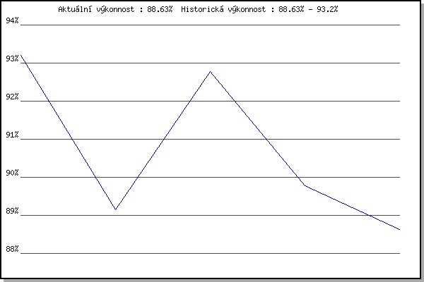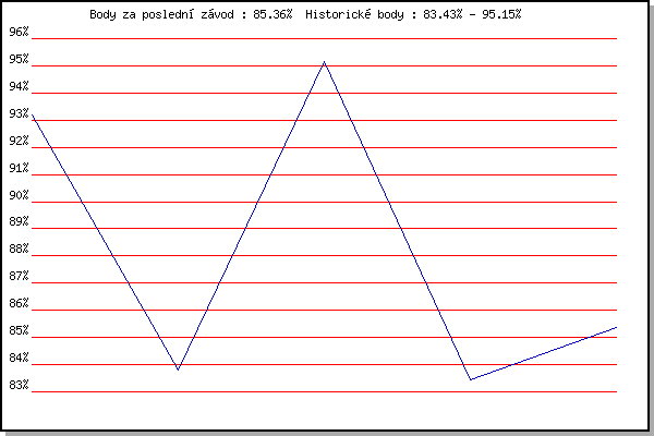 Závod| Body | Výkonnost | Změna | 08.05.2008 | Běh o pohár pivovaru Černá hora, 9.2 | 93.20% | 93.20% | | 28.09.2008 | Blažovice Svatováclavský běh, 11 km | 83.82% | 89.15% | -4.05% | 08.05.2009 | Běh o pohár pivovaru Černá hora, 9. | 95.15% | 92.78% | +3.63% | 15.07.2009 | Pisárky Anthropos, 6.3 km | 83.43% | 89.78% | -3.00% | 28.09.2009 | Blažovice Svatováclavský běh, 11 km | 85.36% | 88.63% | -1.15% | | |