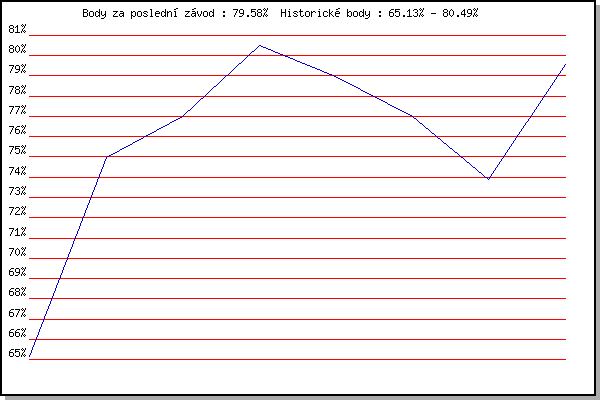 ZávodBodyVýkonnostZměna| 28.09.2007 | Blažovice Svatováclavský běh, 11 km | 65.13% | 65.13% | | | 08.05.2008 | Běh o pohár pivovaru Černá hora, 9.2 | 74.97% | 72.10% | +6.97% | | 21.05.2008 | Obřany, 8.8 km | 76.99% | 75.30% | +3.20% | | 21.09.2011 | AC Moravská Slávia Brno, 1hod atlet | 80.49% | 78.03% | +2.73% | | 28.09.2012 | Blažovice – Svatováclavský běh, 11 km | 78.97% | 78.60% | +0.57% | | 28.09.2013 | Blažovice – Svatováclavský běh, 11 km | 77.02% | 78.31% | -0.29% | | 28.09.2014 | Blažovice – Svatováclavský běh, 11 km | 73.88% | 77.32% | -0.99% | | 28.09.2015 | Blažovice – Svatováclavský běh, 11 km | 79.58% | 78.20% | +0.88% | | | | |