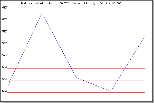 Závod| Body | Výkonnost | Změna | 09.07.2014 | Popůvky, 7.9 km | 54.55% | 54.54% | | 23.07.2014 | Pisárky Anthropos, 6 km | 60.68% | 58.87% | +4.33% | 30.07.2014 | Palackého vrch, 7.1 km | 55.25% | 57.49% | -1.38% | 29.07.2015 | Palackého vrch, 7.1 km | 54.10% | 56.44% | -1.05% | 05.08.2015 | Obřany, 8.8 km | 58.76% | 57.47% | +1.03% | | |