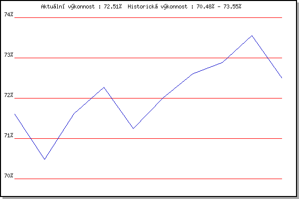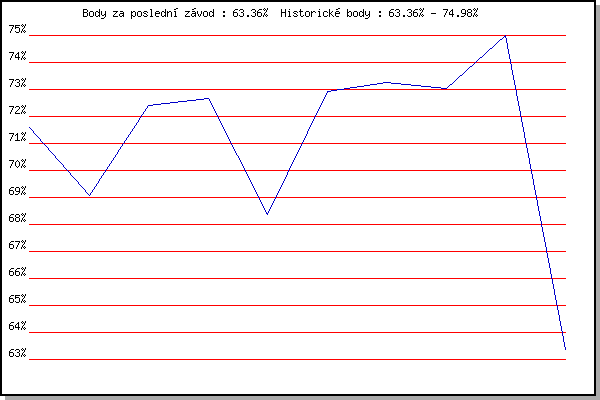 ZávodBodyVýkonnostZměna| 14.05.2008 | Pisárky Anthropos, 6.3 km | 71.60% | 71.60% | | | 21.05.2008 | Obřany, 8.8 km | 69.06% | 70.48% | -1.12% | | 28.05.2008 | Líšeň Mariánské údolí, 11.1 km | 72.42% | 71.62% | +1.14% | | 04.06.2008 | Veselka, Popůvky Vintrovna, 9.6 km | 72.65% | 72.27% | +0.65% | | 18.06.2008 | Obřany, 8.8 km | 68.37% | 71.25% | -1.02% | | 30.07.2008 | Obřany, 8.8 km | 72.92% | 72.01% | +0.76% | | 06.08.2008 | Líšeň Mariánské údolí, 11.1 km | 73.27% | 72.60% | +0.59% | | 13.08.2008 | Veselka, Popůvky Vintrovna, 7.9 km | 73.02% | 72.89% | +0.29% | | 20.08.2008 | Moravská Slavia dráha, 10 km | 74.98% | 73.55% | +0.66% | | 01.07.2009 | Líšeň Mariánské údolí, 11.1 km | 63.36% | 72.51% | -1.04% | | | | |