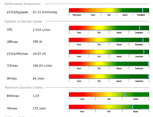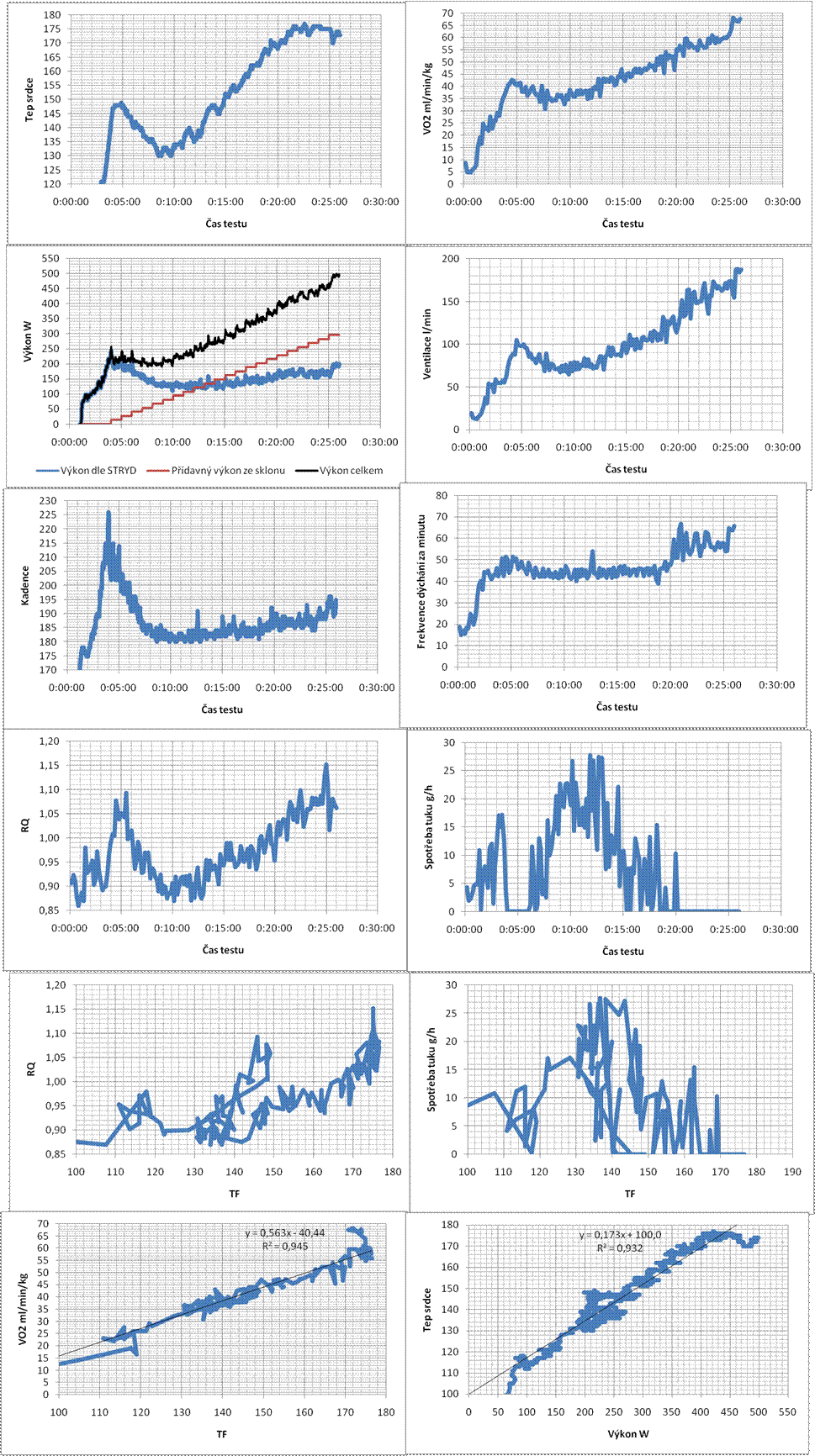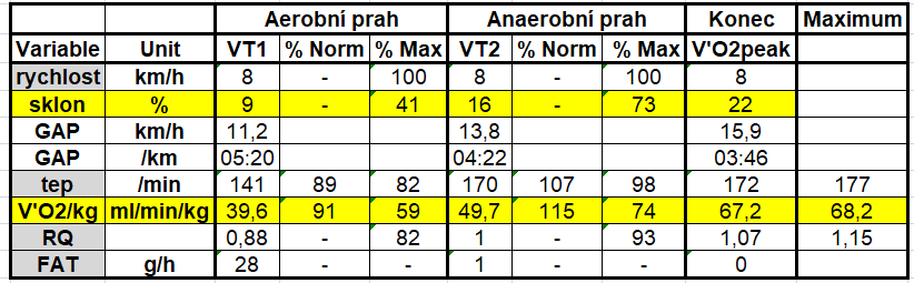 Anaerobní práh vyšel při sklonu 16% při tepu 170, VO2 činí 49,7 ml/kg, jedná se