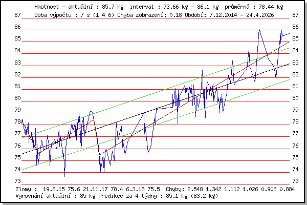 Průměrná hmotnost: 77.91 kg (odchylka: 2.21 kg, autokorelace: 0.951, 2.řád: 0.927)